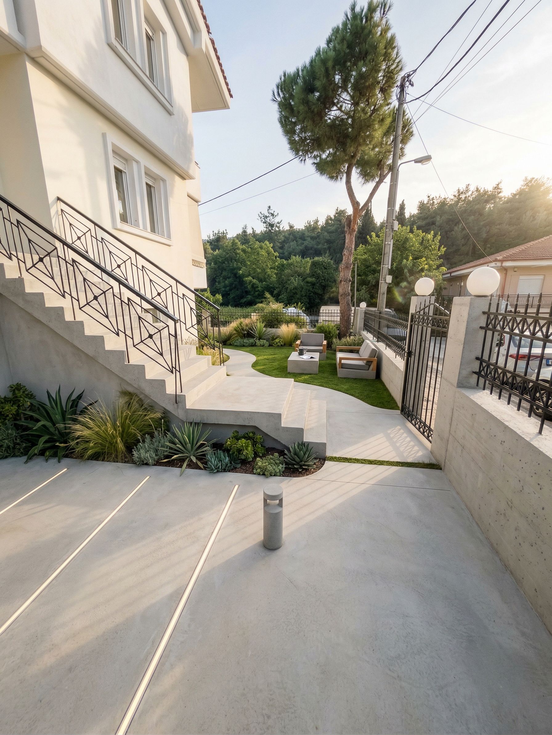Promptcreate a beautiful exterior garden with furniture and grass. , keep exact camera angle , remove stone and put concrete, replace the marble with beautiful concrete., keep exact camera angle