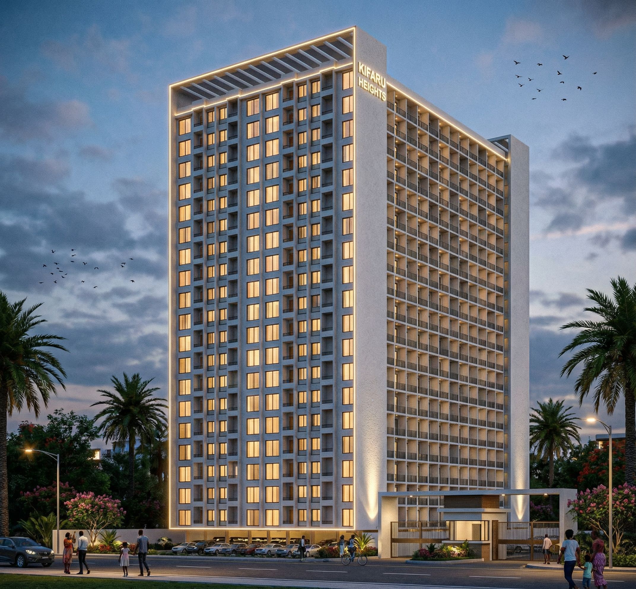 PERSPECTIVE SHOWING AN APARTMENT IN A RESIDENTIAL SUBURB WITH LIGHTS TURNED ON IN THE BUILDING. INCLUDE SOME SPOT LIGHTS, ROPE LIGHTS AND STREET LIGHTS IN THE IMAGE. INCLUDE SOME VISITORS PARKING IN FRONT OF THE BUILDING. PUT VEHICULAR ENTRY AND EXIT ON THE RIGHT SIDE. MAKE GLASS CLEAR, REFLECTIVE AND REALISTIC. USE WHITE WALL MASTER AS A FINISH. INCLUDE SOME BIRDS IN THE SKY AND PEOPLE OF AFRICAN ORIGIN IN THE FOREGROUND AND SOME CHILDREN TOO. INCLUDE GRAPHICS."KIFARU HEIGHTS" ON THE BUILDING. MAKE COLOUR OF BUILDING PEARL WHITE., keep exact camera angle. MAINTAIN THE ORIGINAL DESIGN. MAINTAIN ORIGINAL ARCHITECTURAL DESIGN., keep exact camera angle, keep exact camera angle
