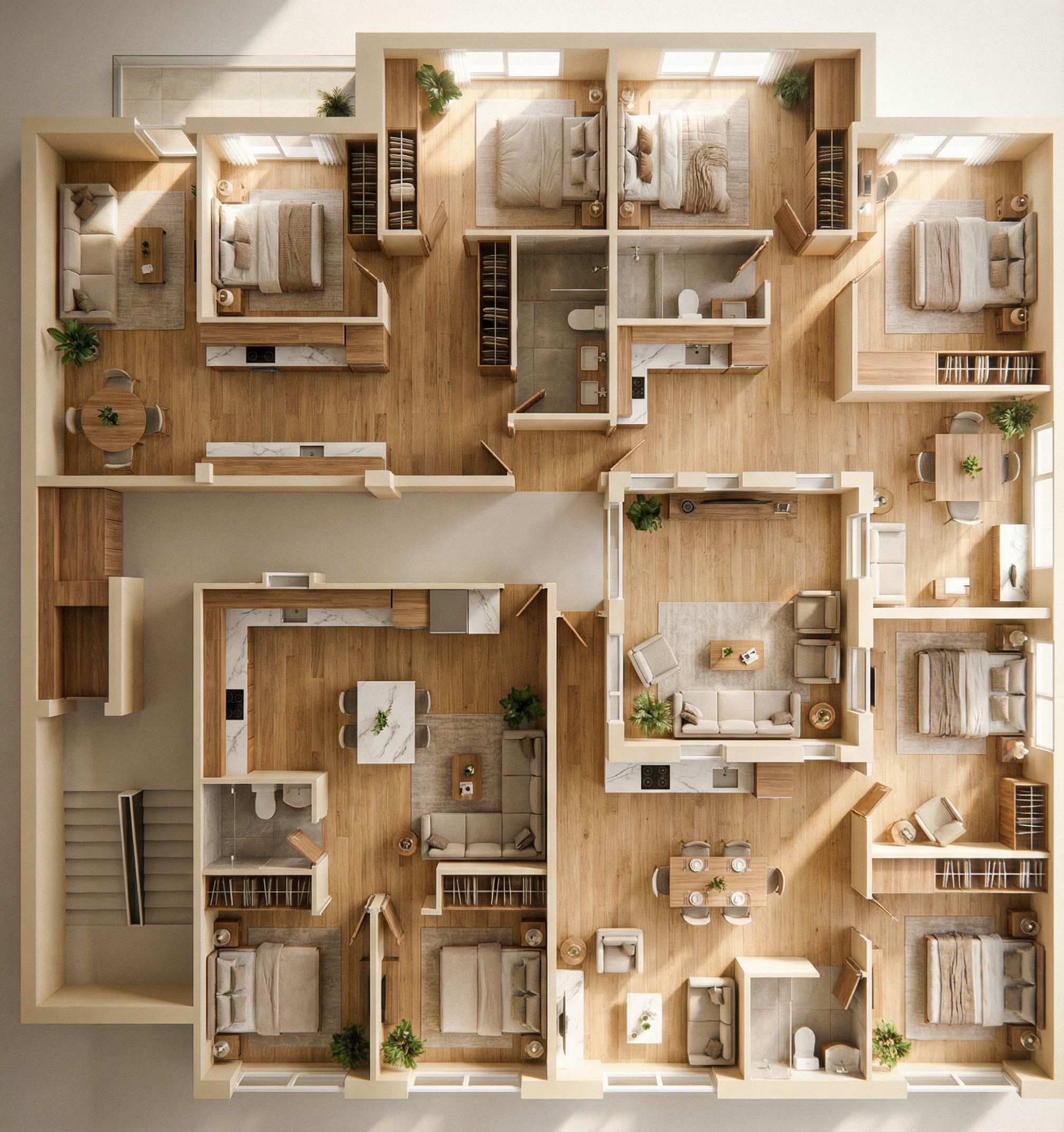 PromptA high-quality 3D architectural floor plan render of the four apartments shown in the blueprint. The view is a top-down perspective with no roof to show the interior layout. The interior design is modern and elegant with warm finishes: light oak wood flooring throughout, soft beige and cream walls, and contemporary wooden furniture. The kitchens feature sleek wooden cabinetry and white marble countertops. The bedrooms have plush textiles in neutral tones. Soft, warm ambient lighting illuminates the spaces, creating a cozy and luxurious atmosphere. High-resolution, photorealistic, clean lines, and professional architectural visualization.