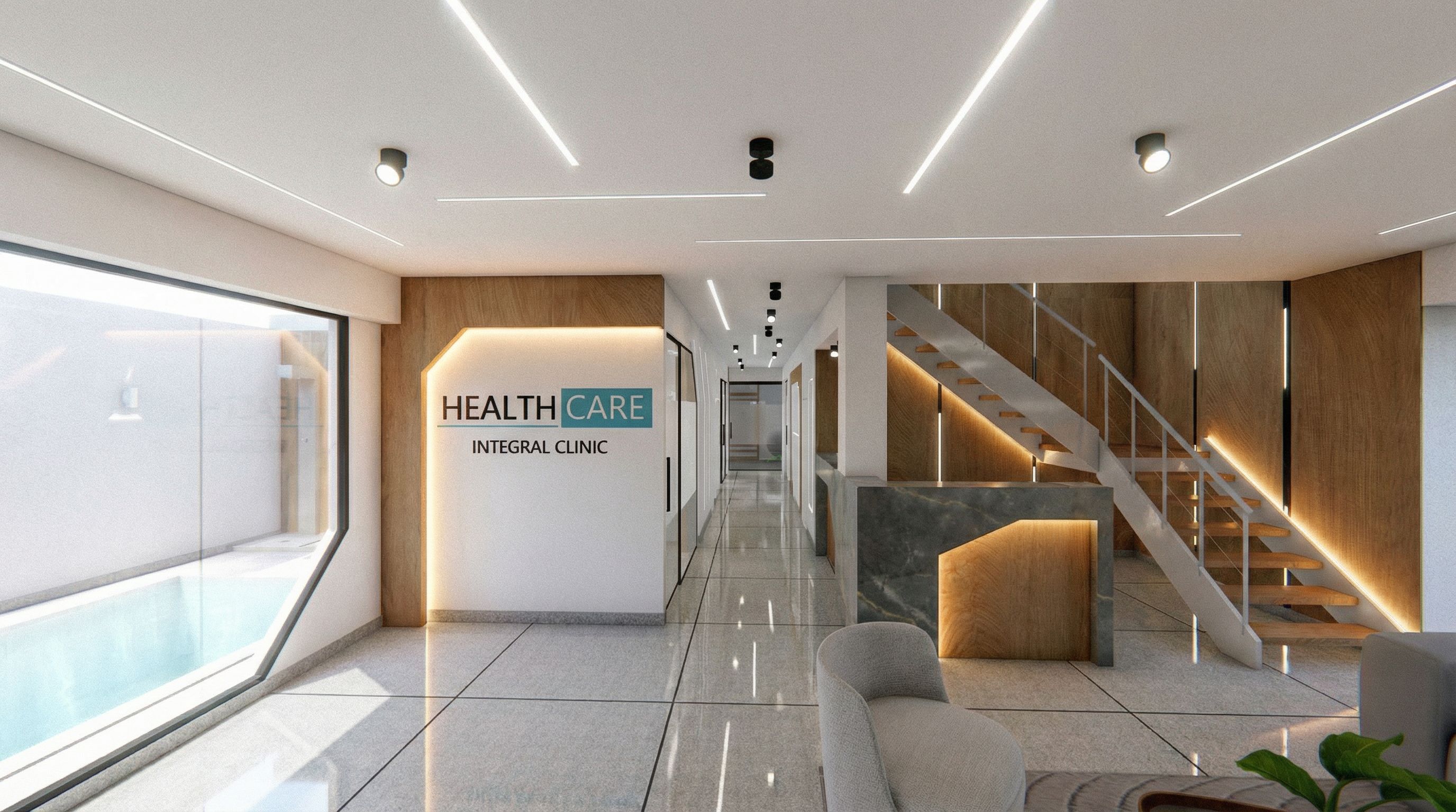 PORFAVOR AÑADE EL EFECTO DE LA ILUMINACION ES BLANCA PORQUE ES UNA CLINICA SOLO AÑADE LUZ INDIRECTA CALIDA EN EL LOGO Y EN LA MADERA QUE LO RECUBRE, Y EN EL MUEBLE DE RECEPCION, EL PISO ES DE GRANITO COLOR GRIS CLARO, keep exact camera angle