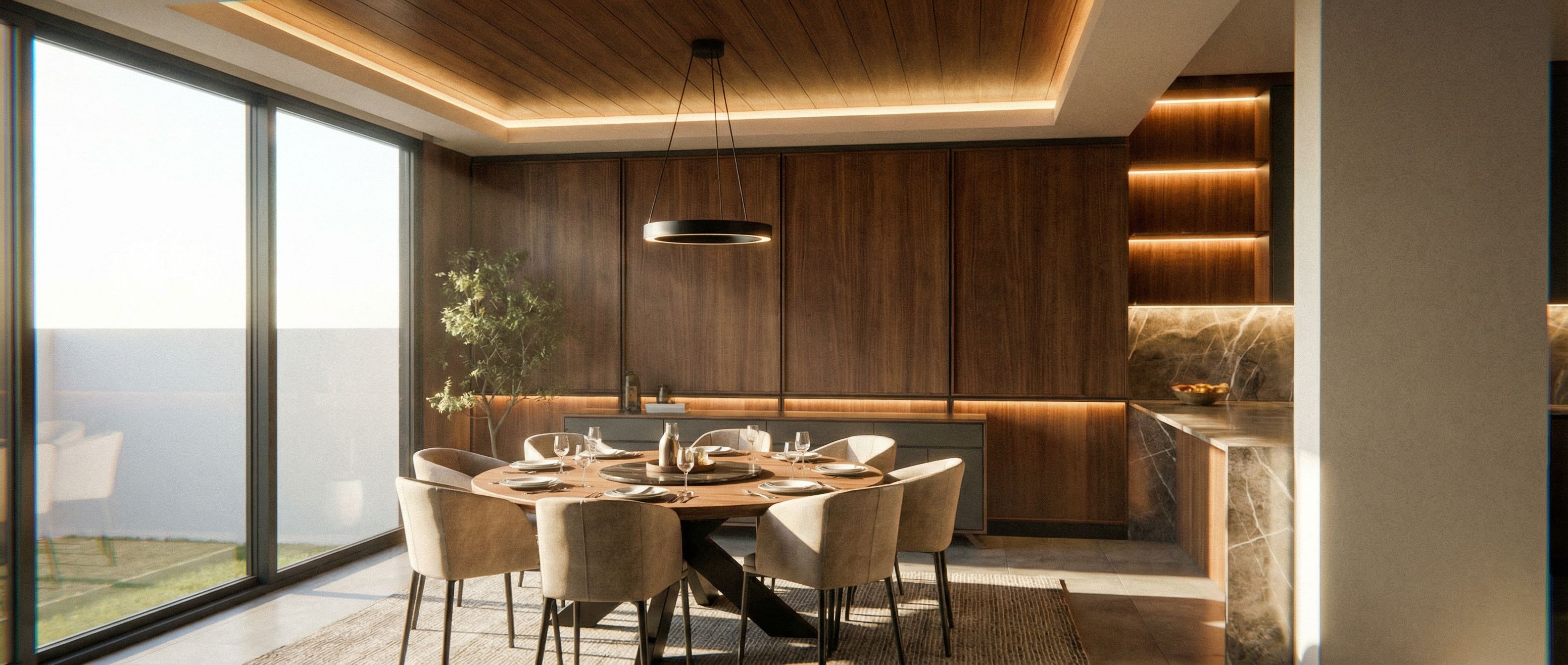 PromptPhoto of a modern dining room showing a round wooden table surrounded by elegant upholstered chairs. The walls are adorned with rich wood paneling. Bright natural light flows through large glass windows, casting soft shadows throughout the space. Captured from an angled perspective, the scene emphasizes the spacious design with a wide lens, highlighting the intricate textures and finishes, creating a warm and contemporary atmosphere. Add warm color LED lighting in specific places respecting the original image, keep exact camera angle