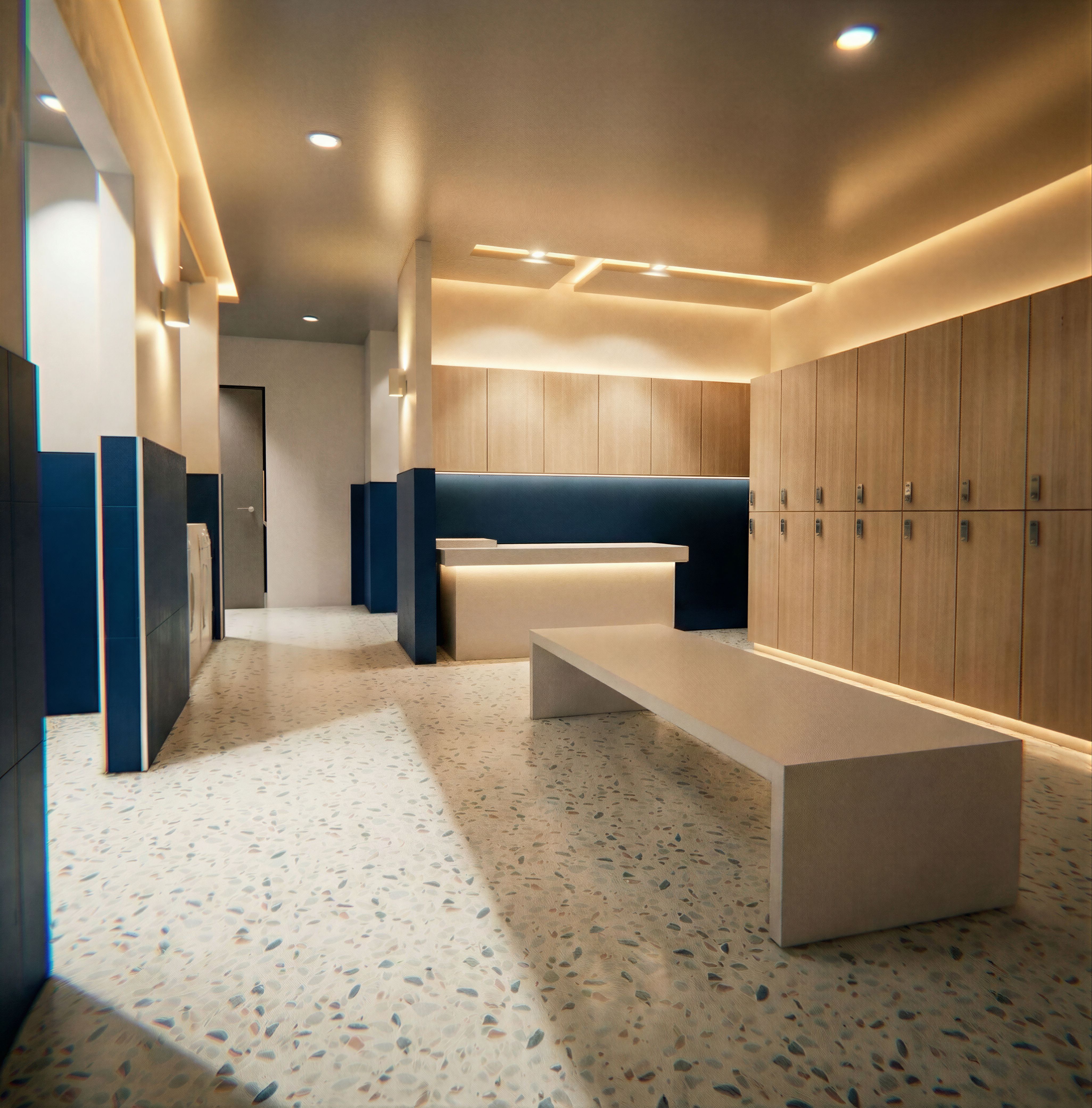Promptאל תשנה גאומטריה , תשנה רק את הצבע של הלוקרים לצבע עץ בהיר ואת הקרמיקה לכחול מאט כמו הרפרנס המצורף, keep exact camera angle