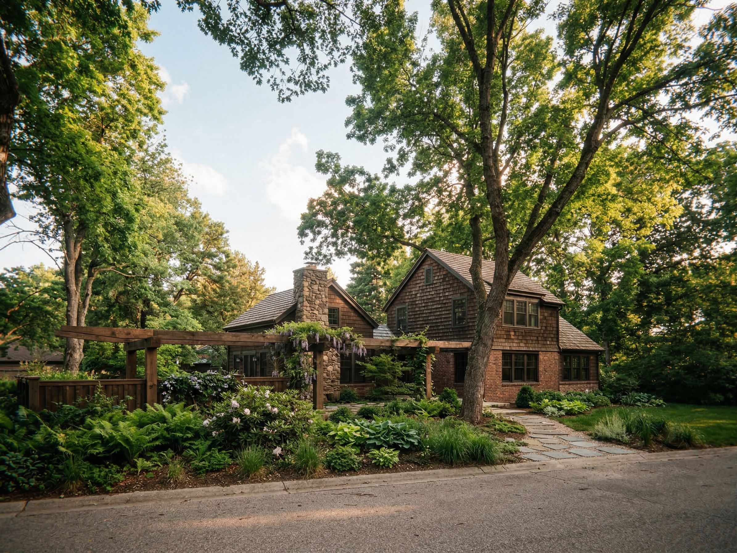 arts and crafts, woodsy with another simila runit added to the left with trellis extended beyond it, keep exact camera angle