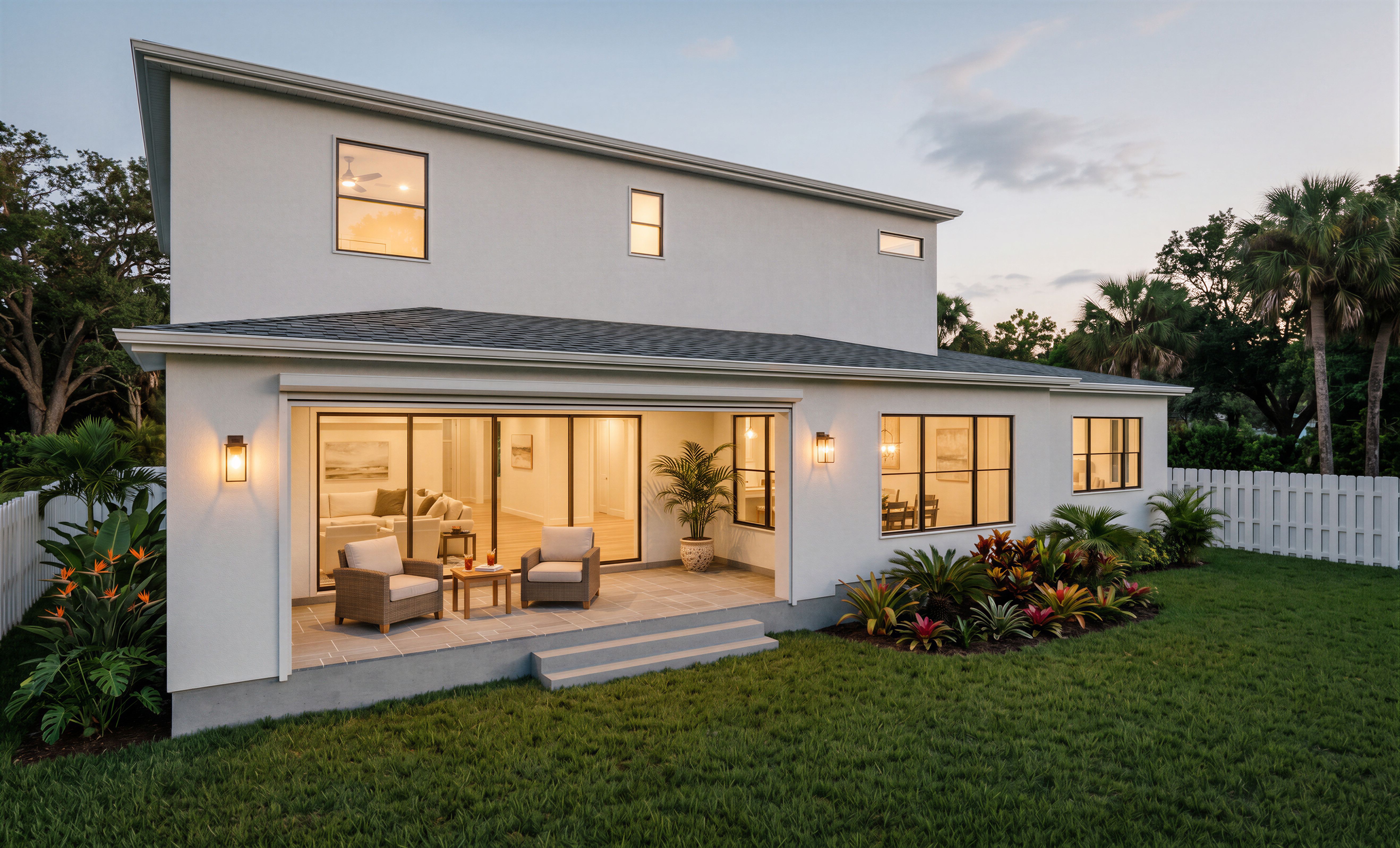 EnhancedPromptMake photo-realistic renderings of this house image; Exterior walls are smooth finish white stucco; Roof is Pewter Gray shingles; Grass in the front, flower bed to the right of the concrete steps, tall planting on the left side of the house, between the house and the left white fence, make flower beds typical for Florida; Trees on the left and right of the house in the background Exterior lights are on; Lights on in the interiors are on; The outdoor room is Lanai type, make it feel Southern, add furniture and misc. items per Florida look, do not place furniture in the space between the sliding door concrete steps, add rolled up screen; Keep existing doors, Keep existing windows, Do not add windows, do no add doors Keep exact camera angle Keep exact camera angle Keep exact camera angle, keep exact camera angle