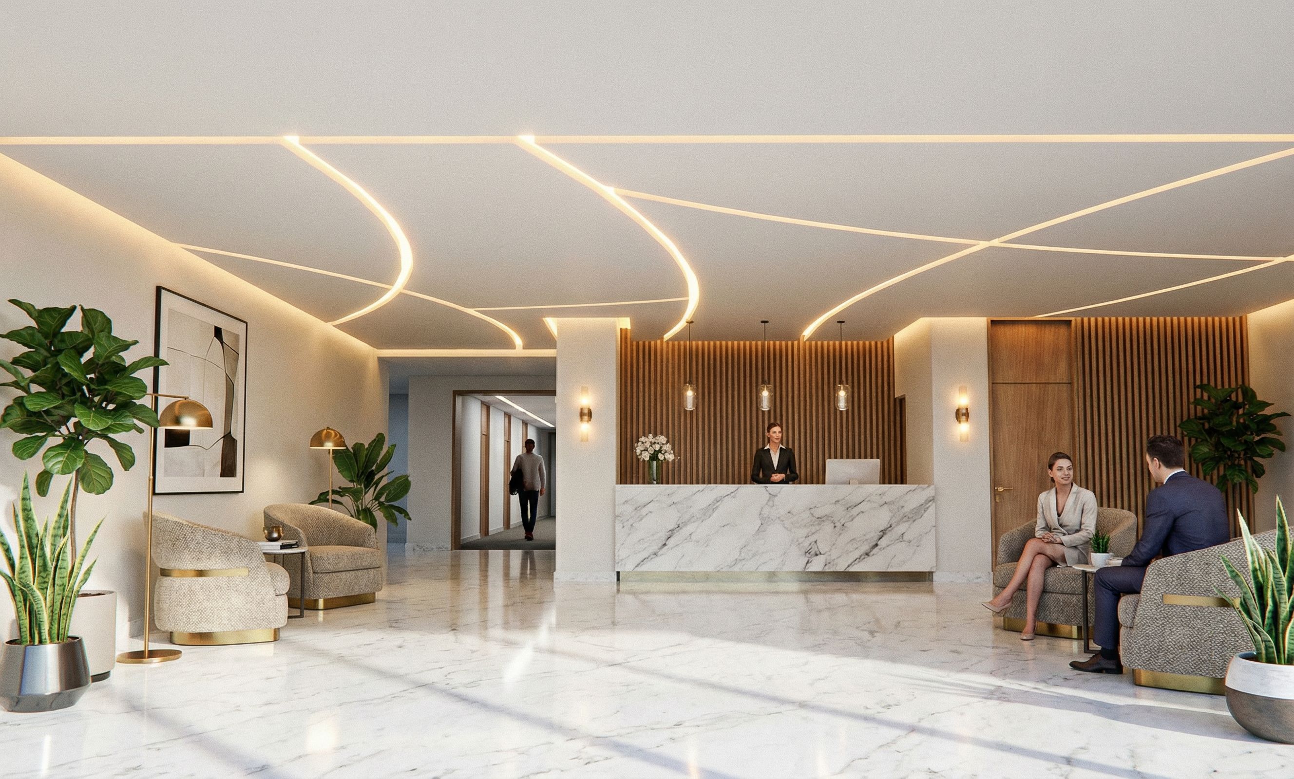 Entrance lobby, in the central part with marble reception bar and white Carrara marble floor, indirect perimeter lighting, indirect lighting in the ceiling along the curved lines, comfortable waiting chairs, minimalist atmosphere, respecting the sample image where the ceiling is shown, there is a hallway at the back that connects to a corridor,