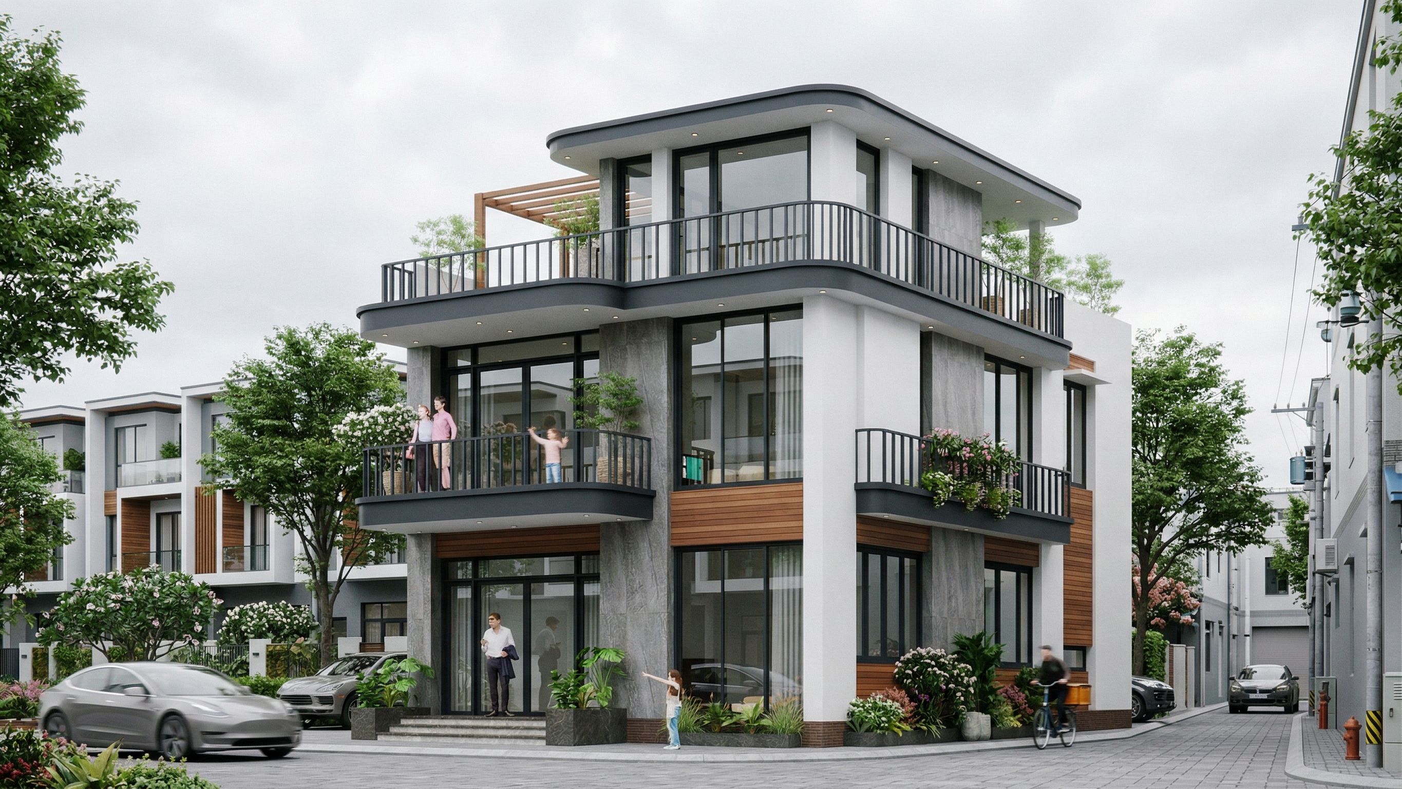 PromptThis photograph captures a modern three-story apartment building, notable for its combination of gleaming white walls, dark metal railings, and warm wood accents. Surrounding greenery and balconies create a vibrant atmosphere. The building is situated in a lush urban environment, with a small alley to the right and a row of townhouses to the left, contributing to an enhanced quality of life. Cloudy daylight creates soft shadows, illuminating the expansive glass facades. Inside, bright light highlights the reflections of the glass and surrounding structures. Without altering the building's structure, the photograph is taken from a low angle to emphasize its height, using a wide-angle lens to encompass the entire scene, highlighting the architectural features and the welcoming atmosphere., keep exact camera angle