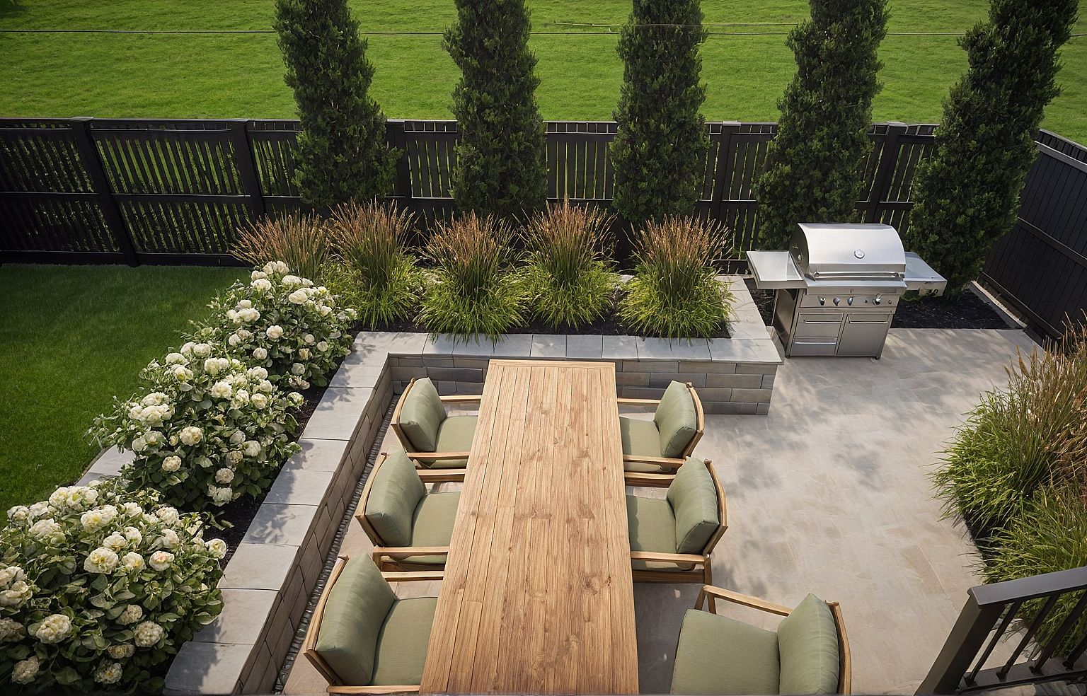 PromptPhoto of an outdoor dining area featuring a long wooden table surrounded by cushioned chairs, situated in a landscaped backyard. The scene includes lush green grass, vibrant flowers, and tall shrubs creating a natural border. A modern grill is positioned nearby, suggesting an inviting atmosphere for gatherings. Soft, natural lighting illuminates the space, casting gentle shadows on the patio. Captured from an elevated angle, the composition highlights the arrangement and design details, showcasing the integration of indoor and outdoor living elements.