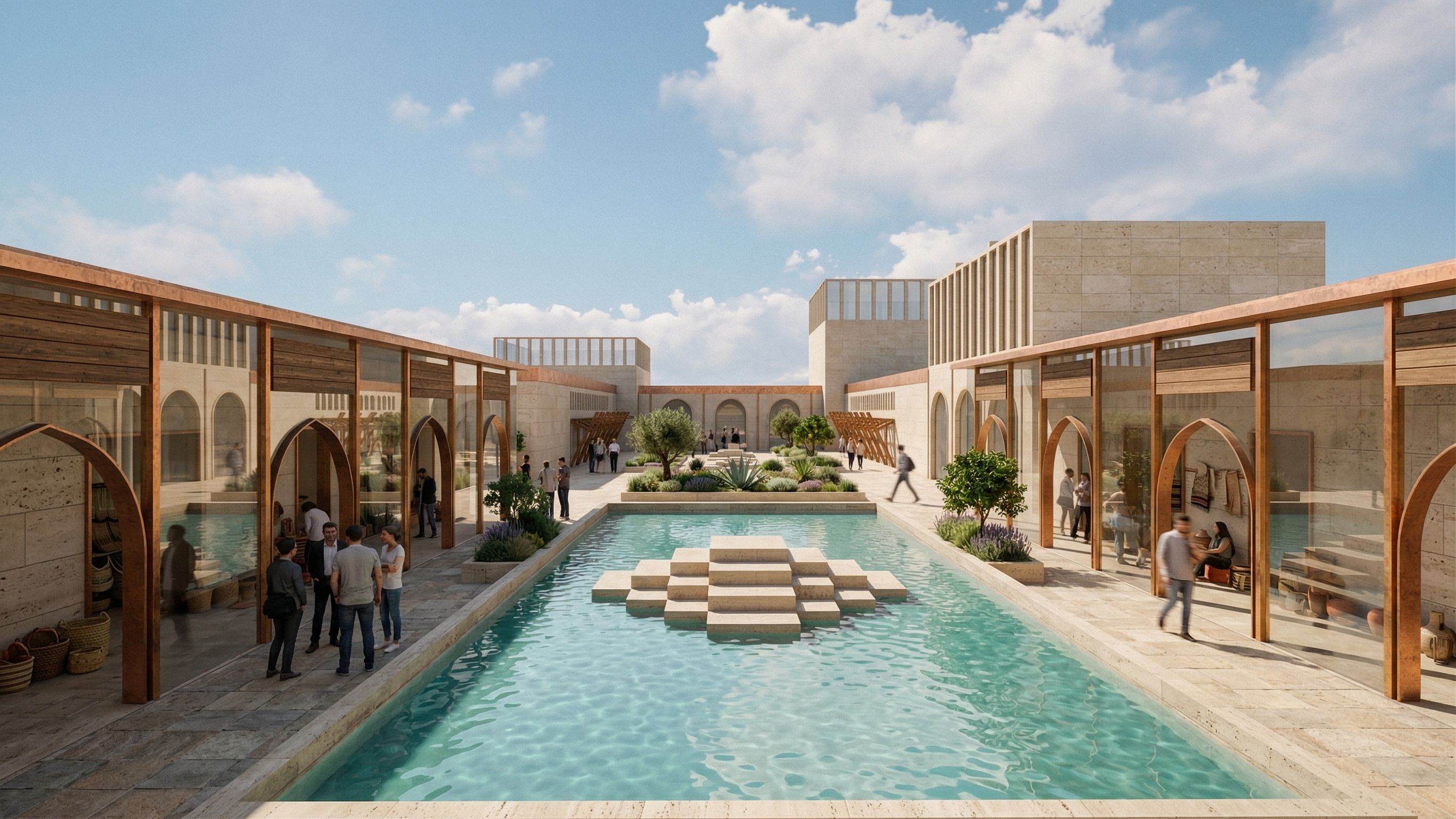 Enhance this architectural render of a handicrafts market that showcases traditional crafts in a contemporary way. Keep the original design completely unchanged: • do not modify the building’s form, massing, proportions, facade, or architectural composition • keep the exact same camera angle and perspective Improve materials and realism: • clad the main building with elegant beige natural stone with subtle texture and realistic imperfections • enhance all materials to be highly photorealistic glass reflections, stone roughness, shadows, depth Site and landscape enhancements: • preserve the existing layout exactly as is • replace green-marked areas with trees and soft landscaping • replace blue-marked areas with realistic water features reflective, slightly dynamic surface • add realistic people walking, gathering, and enjoying the outdoor courtyards Lighting and environment: • enhance sunlight to natural warm daylight with soft shadows • improve sky and weather for a clean, realistic atmosphere • use global illumination and high dynamic range lighting Rendering quality: • ultra photorealistic • high resolution 4K or higher • cinematic composition • sharp details, realistic depth of field, keep exact camera angle