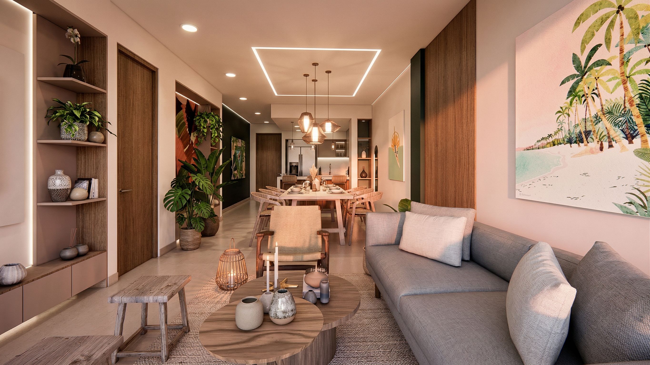 PromptPhoto of a modern interior design space with an open dining and living area. keep materials, make them realistic. Highlight the stylish pendant lighting and soft natural light casting gentle shadows. Incorporate a cozy seating nook adorned with greenery and a contemporary coastal dining table set with elegant ceramics. Use a wide-angle perspective to capture the spaciousness, focusing on clean lines and harmonious color contrasts, with a lens that enhances depth and clarity in the overall scene. caribbean light ambient color, keep exact camera angle