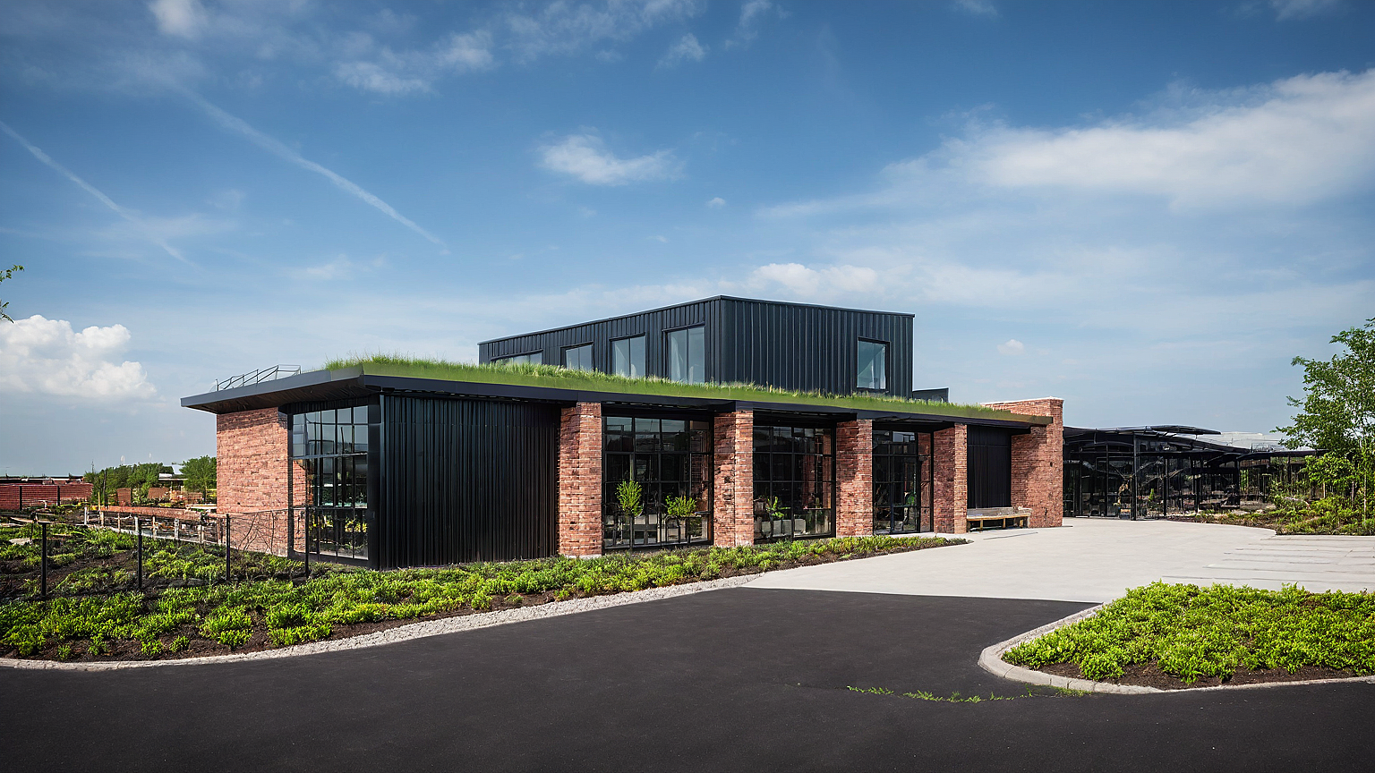 Promptdetailed photo of garden center with green roof, brick pilar and black steel facade