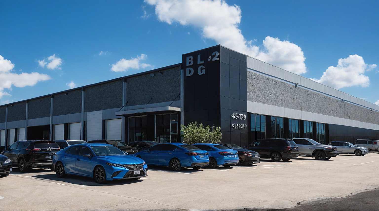Promptthis building has exposed aggregate concrete painted with grey stripes. the corner has matte black metal panels. there is an awning over the entry door and dense bushes near the corner in the middle. the sky is bright blue