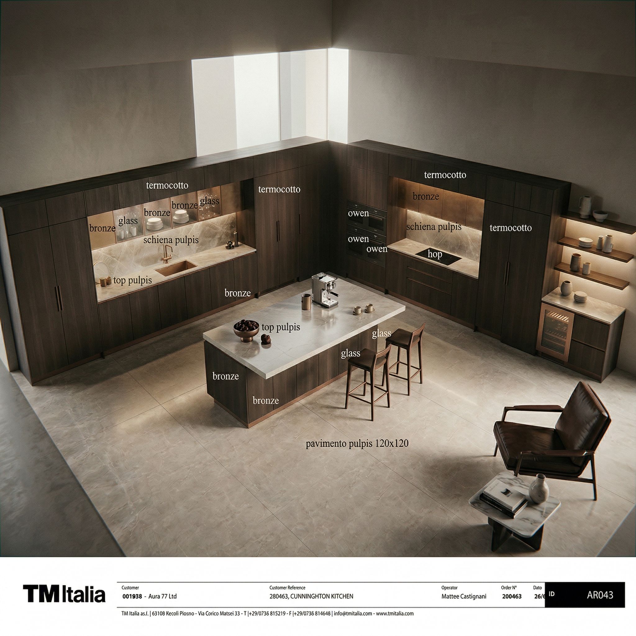 change the floor to pulpis and the worktop to pulpis, follow my istruction on the wall units where it says glass leave glass and where it says bronze keepit bronze, all the lower cabinets near the sink unit in termocottoalso the lower cabinets on the hob units and next to it in termocotto handles in the column recess in the doors in termocotto, worktop on the island nake it rectagular shape to go over the cabinet match with the longer part, keep exact camera angle