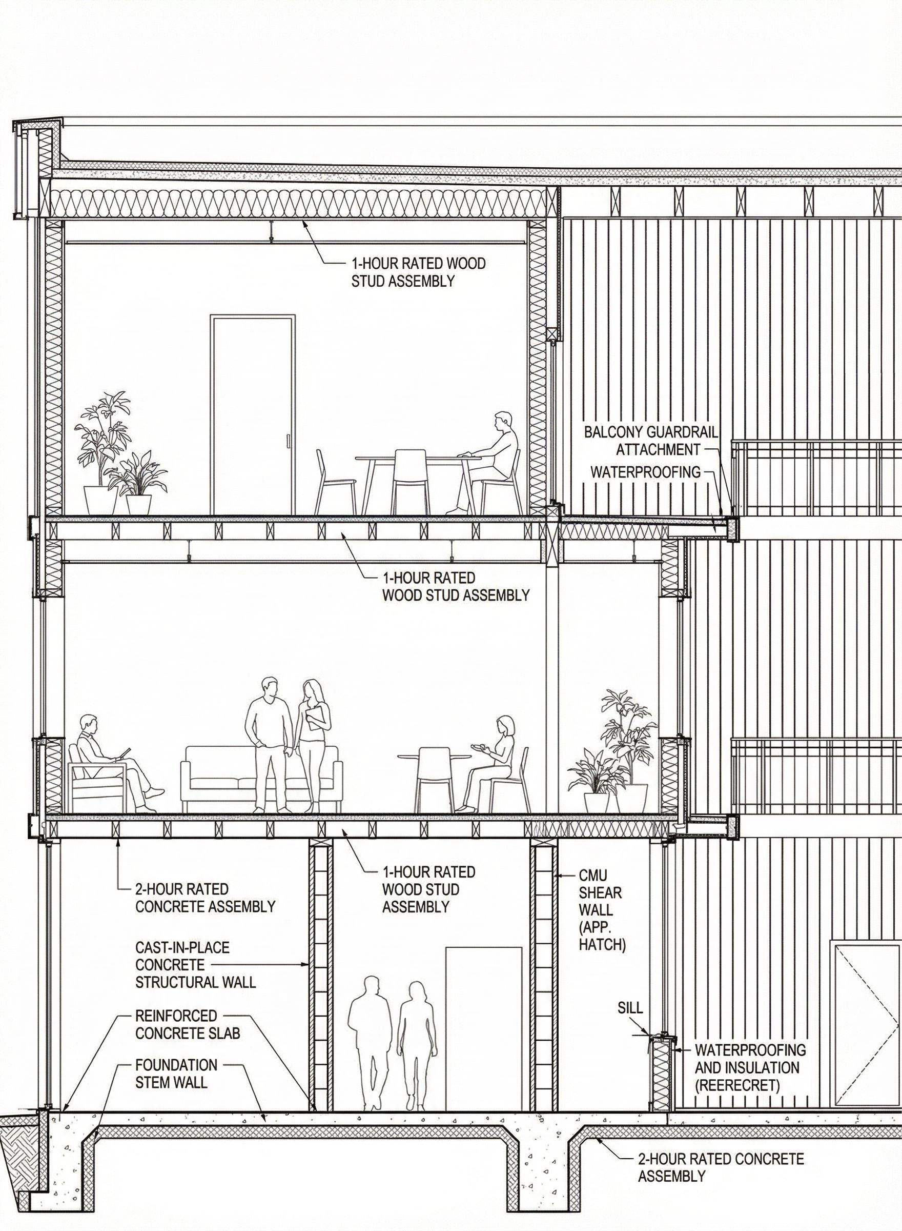 interior design rendering, render this wireframe into technical drawing, “Render this architectural building section as a highly detailed technical wall-section drawing. Keep all original geometry exactly the same, but enhance clarity, lineweights, and material expression. Show this section using clean black linework on a white background, consistent with architectural drafting standards. Bottom floor should appear as Type I concrete construction: – cast-in-place concrete structural wall – reinforced concrete slab – waterproofing and insulation layer – foundation stem wall – sill flashing – CMU or concrete shear walls where appropriate Upper floors should appear as Type V wood construction: – 2×6 wood stud exterior wall – exterior wood composite slat cladding horizontal or vertical – exterior air barrier + sheathing – batt insulation in stud cavity – interior gypsum board – floor assembly with joists, subfloor, and ceiling finish below Include all fire-rating indications: – 2-hour rated concrete assembly at ground level – 1-hour rated wood stud wall assemblies above Add all typical wall-section details: – roof parapet + coping – balcony waterproofing + guardrail attachment – exterior window head, jamb, and sill details – flashing at every penetration – structural connections joist-to-wall, slab-to-wall – insulation, vapor barrier, and air barrier layers – section poche for cut elements dark filled – lineweight hierarchy cuts bold, backgrounds thin – material hatches concrete stipple, wood framing hatch, insulation pattern Lighting should be neutral and flat—no shadows. This is a technical drawing, not a render. Keep EVERYTHING crisp, legible, and clean.”, keep exact camera angle, including people, furniture, indoor plants, high quality, professional, detailed scene