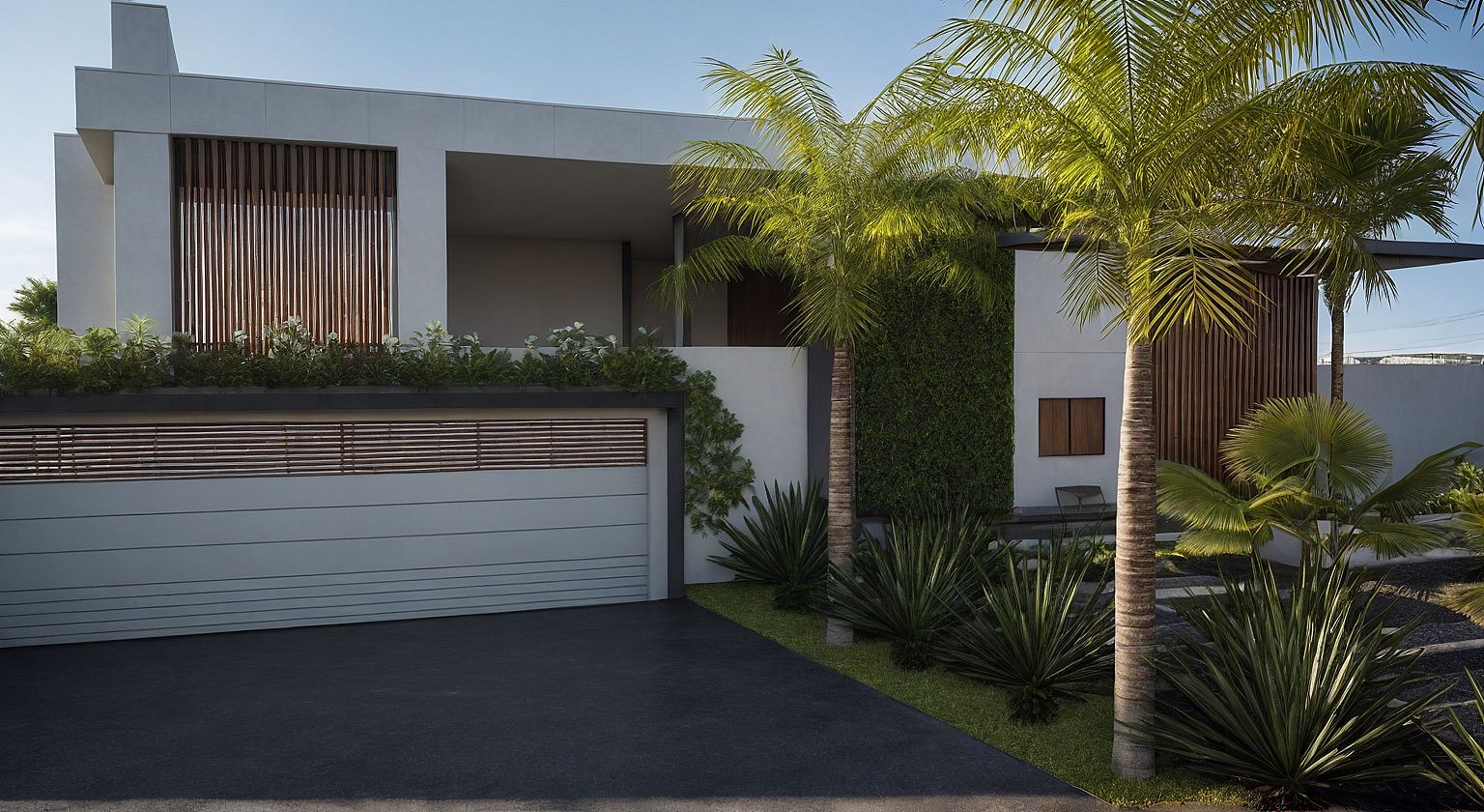 Promptrealista, preciso, textura viva, painel de plantas ao lado da porta, entrada da garagem de cimento