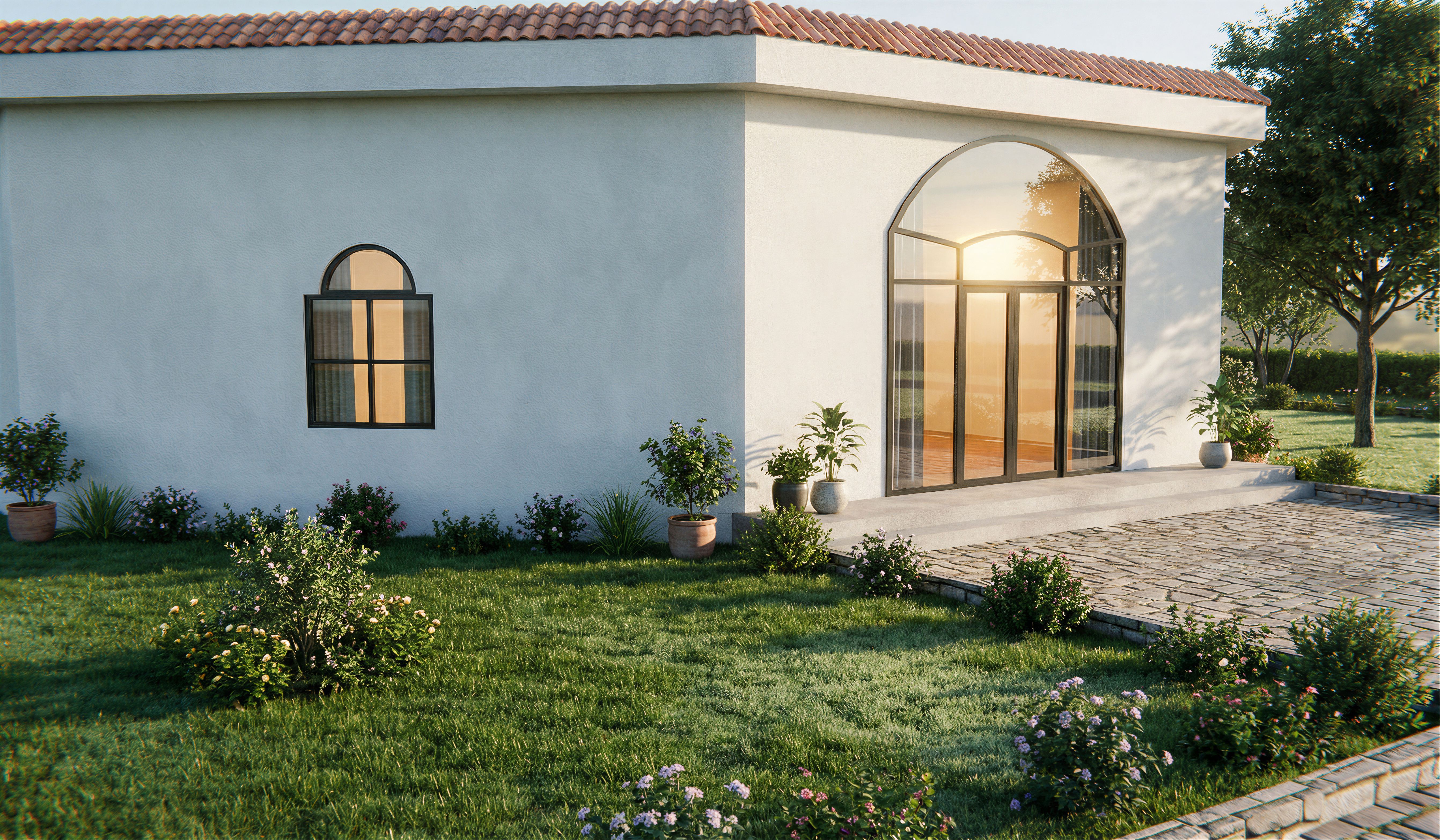 PromptPhoto of a modern residential building featuring smooth white plastered walls, an elegant arched entrance with expansive glass doors, and a terracotta tiled roof. Surrounded by manicured green lawns and a patterned stone pathway leading to the entrance. Soft morning light casts gentle shadows, highlighting the textures of the building’s façade. Captured from a low angle to emphasize the entrance, using a wide-angle lens to encompass the inviting atmosphere and surrounding landscape, creating a harmonious blend with the environment., keep exact camera angle