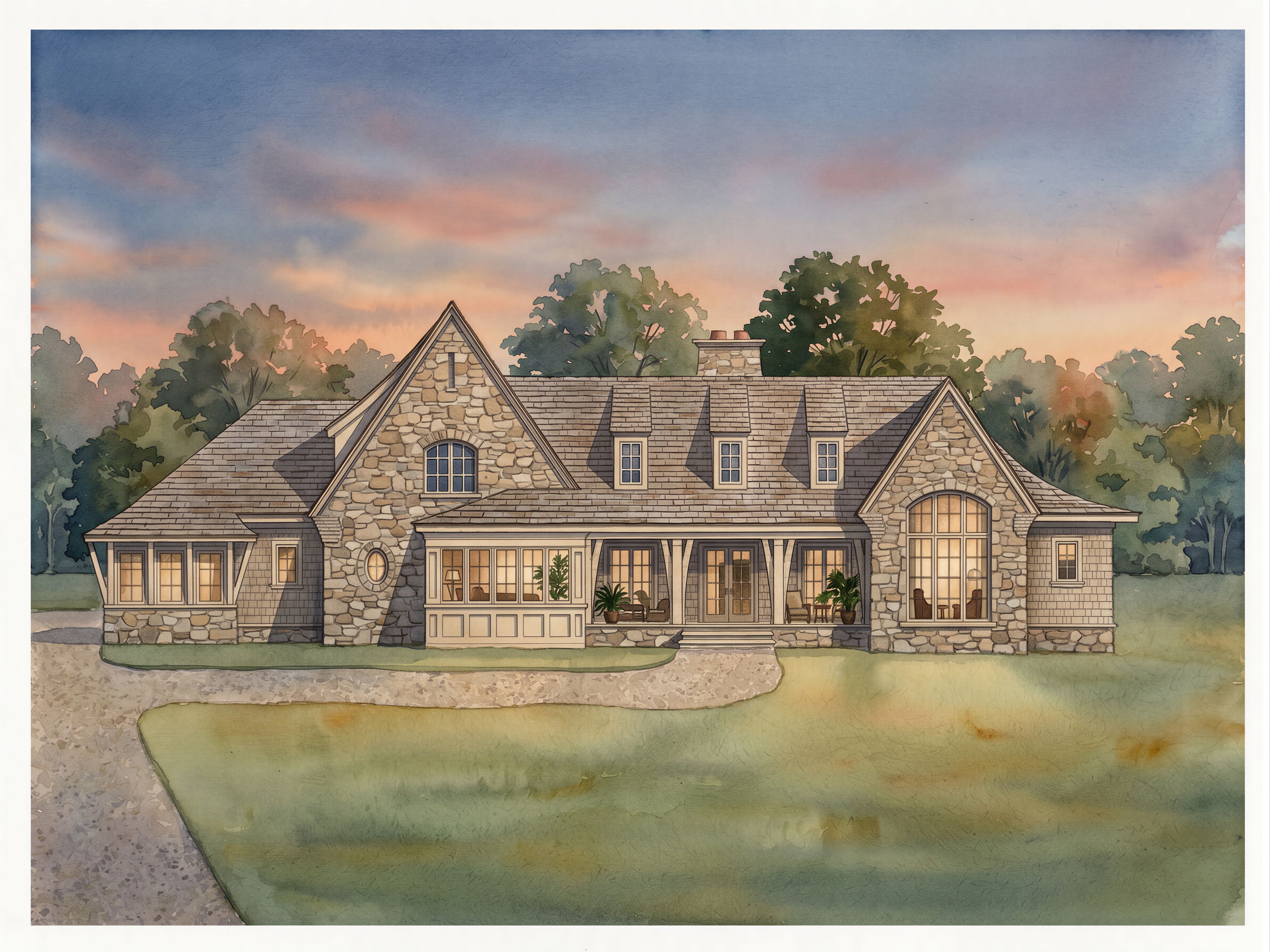 Photo of a contemporary residential home, showcasing intricate stone and wood elements. The façade features large windows framed by elegant stonework and a steeply pitched roof with textured shingles. Set in a serene suburban landscape with trees in the background, emphasizing a tranquil environment. Natural lighting during the late afternoon creates soft shadows and highlights on the surface, enhancing the architectural details. Captured from a frontal perspective with a wide-angle lens, emphasizing the breadth and elegance of the structure., keep exact camera angle