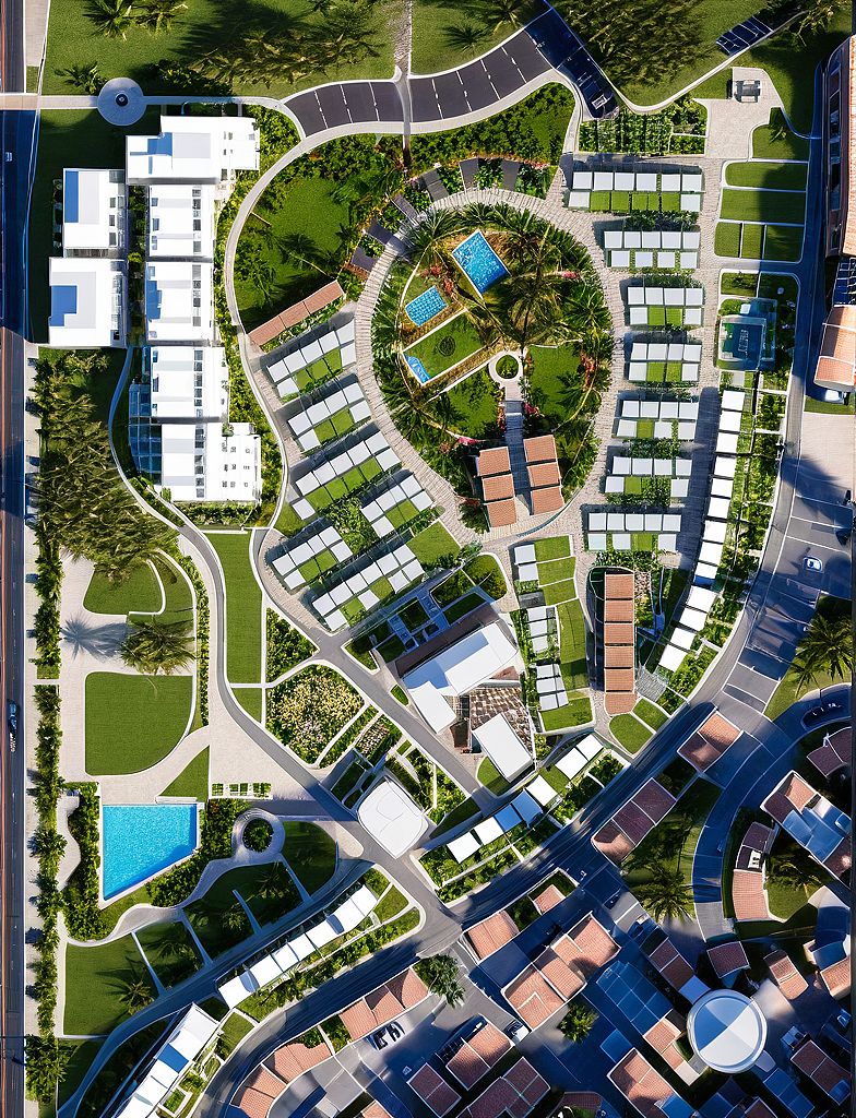 PromptPhoto of a urban master plan layout featuring a mix of residential and commercial buildings. Emphasize varied building designs with modern materials and vibrant colors, surrounded by landscaped parks and green spaces. Located in Aruba. Highlight the integration of a water feature and road systems that navigate through the community. Soft afternoon sunlight casts warm shadows across the scene, enhancing the textures of the buildings. Aerial perspective with a wide-angle lens captures the harmonious relationship between structures and nature, creating an inviting and livable environment.