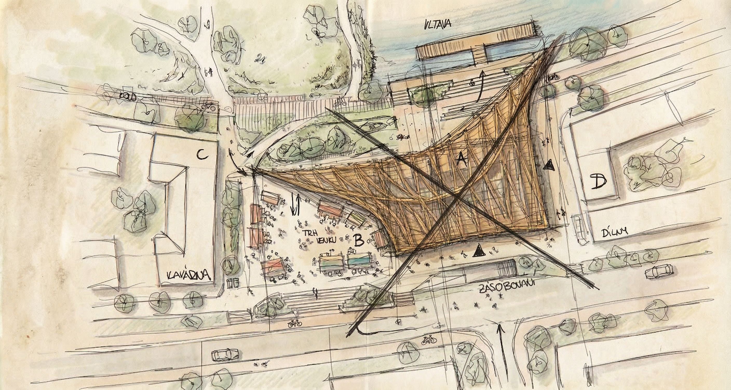 Promptmake the situation in style like in reference photo but alpy it to my uploaded photo...so the roof will be diferent and dont change my autocad things only the stylee of drawing, the roof is this oganic timber flow it needs to stay as in the autocad so the shape and everything, keep exact camera angle