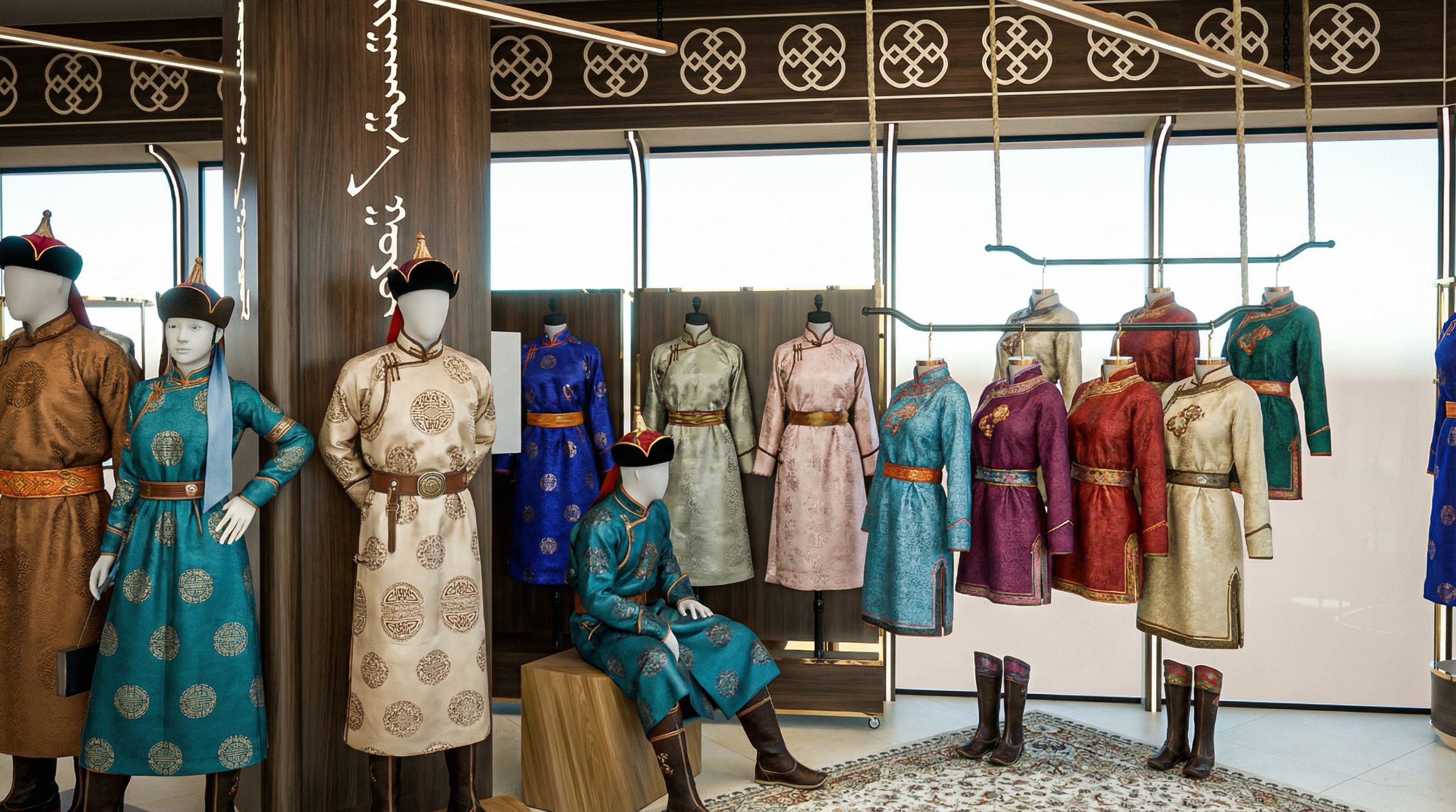 PromptUse the provided image as the base reference. Do NOT change the room size, architecture, furniture design, mannequin positions, shelves, or layout. Preserve the exact same composition, perspective, and proportions. Dress the empty mannequins with authentic traditional Mongolian clothing, specifically Khalkha and Dariganga style garments. The mannequins should wear elegant Mongolian deels with traditional patterns, silk fabrics, belts, detailed embroidery, traditional Mongolian hats, and leather boots. Some mannequins may also display traditional scarves and folded fabrics. For the mannequins suspended from the ceiling, dress them in female Khalkha deels with matching traditional accessories, hats, and boots, styled elegantly to showcase authentic female Mongolian attire. Convert the entire scene into a professional photorealistic retail interior render. Use realistic materials, global illumination, soft shadows, and high dynamic range lighting. The boutique lighting should subtly highlight the mannequins and clothing items. Ceiling light fixtures themselves should not be visible; only the warm, focused light illuminating the products should be seen, creating a premium showroom atmosphere. Ultra realistic architectural visualization, cinematic lighting, high detail textures, 8k photorealistic render, luxury retail interior atmosphere. Only enhance realism, add traditional clothing to all mannequins, and style the ceiling-hanging mannequins in female Khalkha Deels. Do NOT move furniture or redesign the interior.