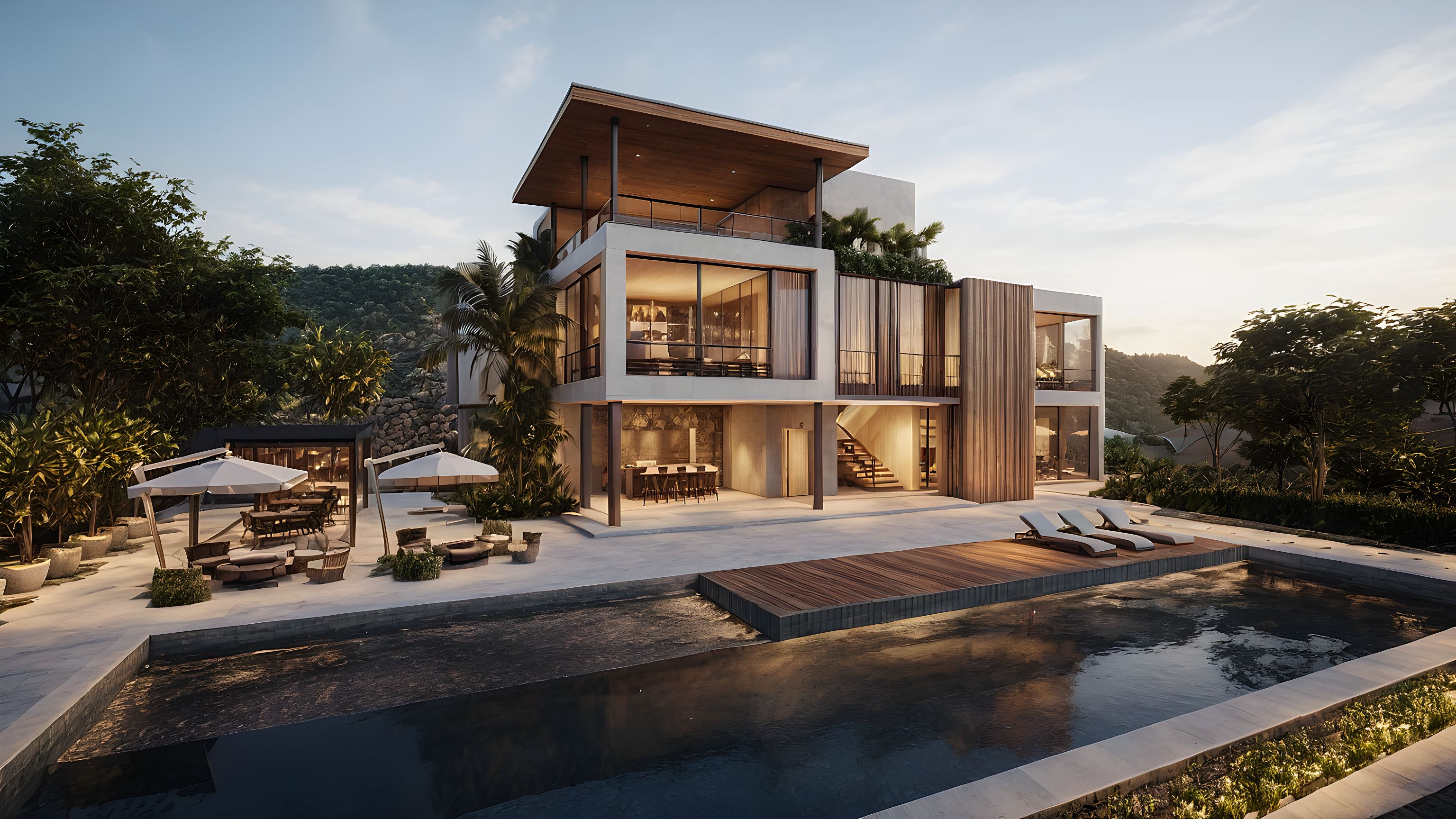 Keep the structural and architectural design of the model. slightly golden hour. Convert more clean the image.