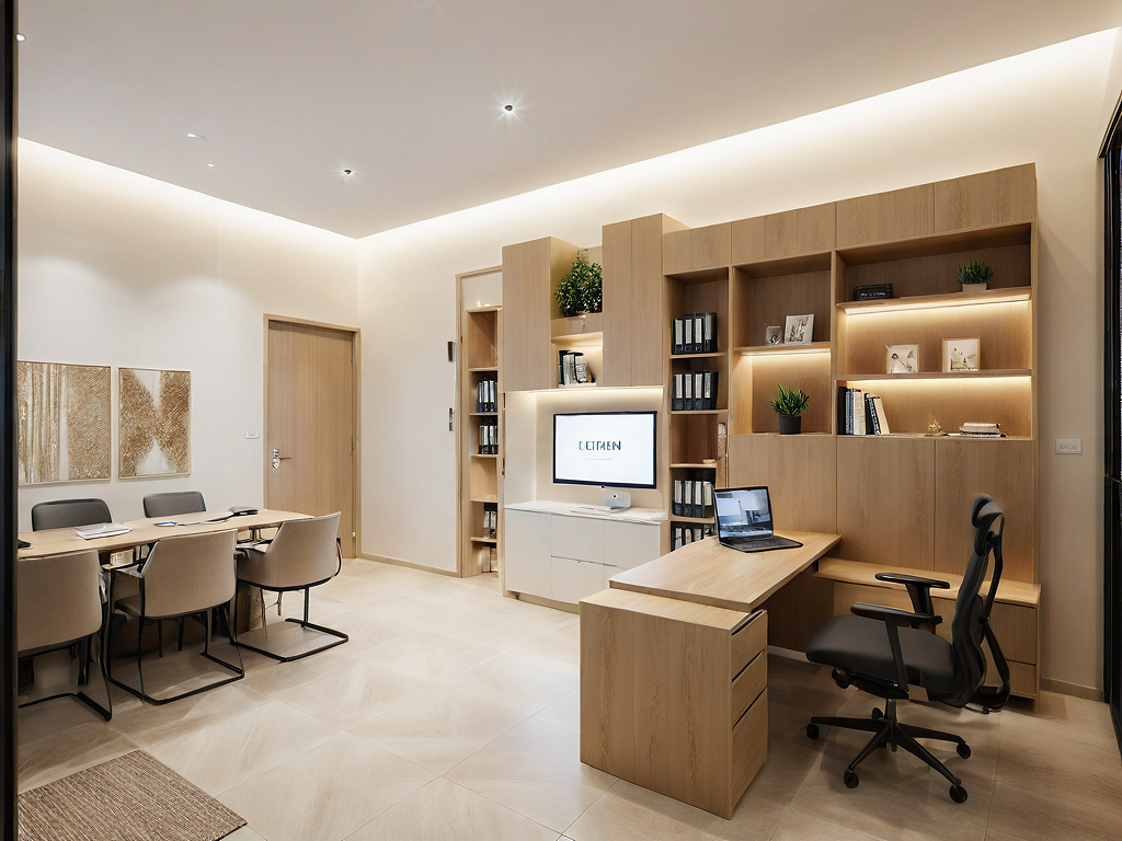 Promptoffice design, modern interior design, cozy, warm, light cream floor color, flat ceiling