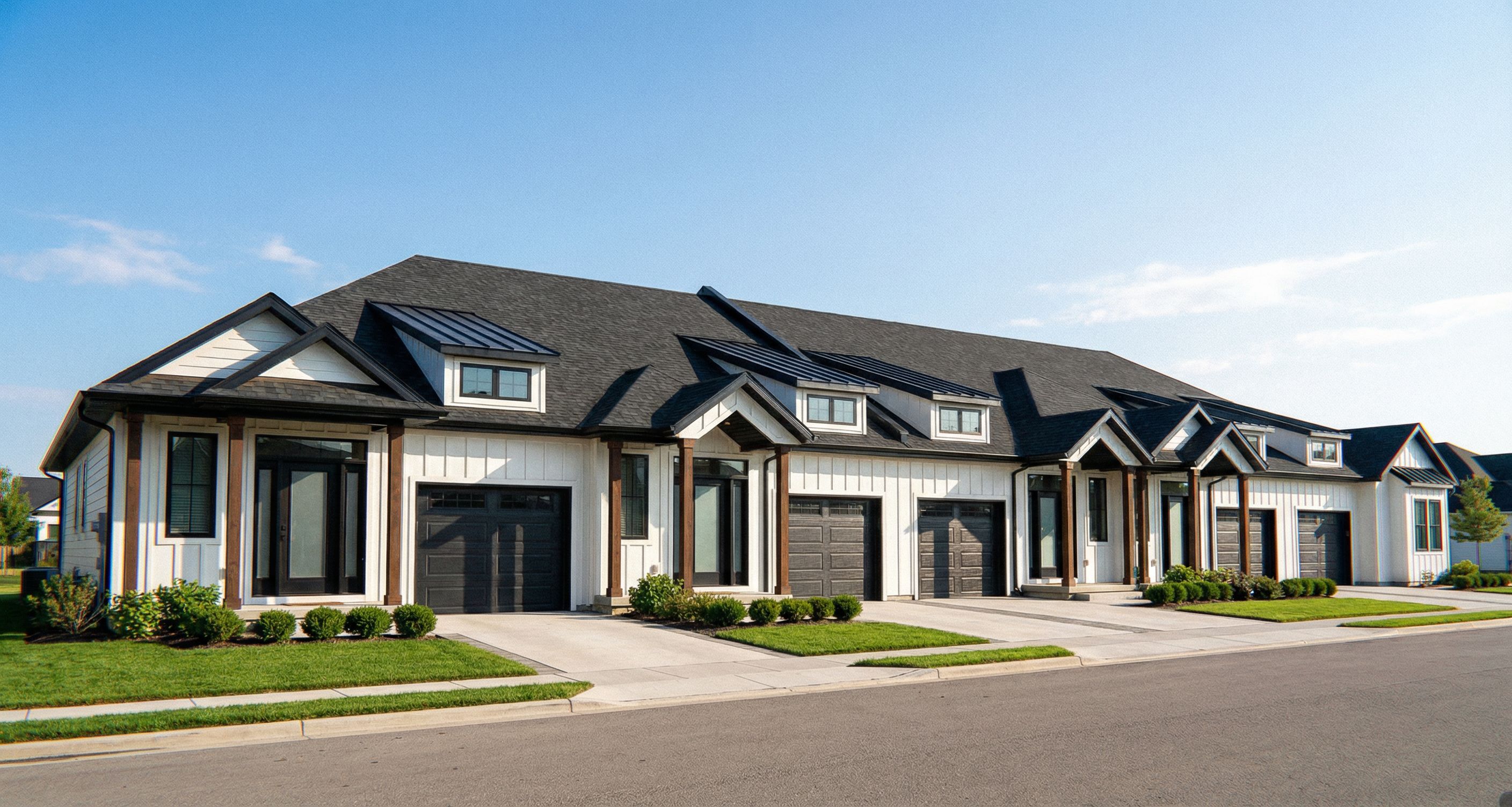 PromptPhoto of a modern townhouse complex featuring multiple attached units, showcasing a combination of white siding and dark shingles. Emphasize the intricate design of gabled roofs, large front windows, and attractive porches. The setting includes manicured lawns and a well-paved driveway leading into the garages. Bright, natural daylight illuminates the facade, creating soft shadows that enhance architectural details. Captured from a low angle using a wide-angle lens, the framing highlights the symmetry and spaciousness of the design, with a clear blue sky in the background., keep exact camera angle