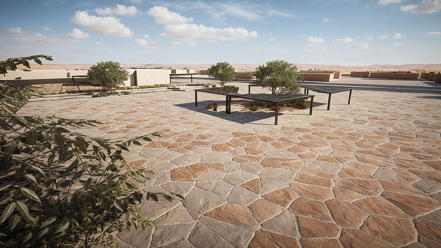 Prompt A neighborhood plaza in AlUla with sandy stone paving, minimal trees, and simple shaded structures. Keep the same layout and geometry. Enhance realism with natural lighting, soft shadows, and detailed earth textures. Use AlUla’s warm tones, sandstone material, and subtle desert vegetation. Add realistic sky, depth, and photographic clarity. Maintain the existing massing of buildings and street pattern without altering the design.