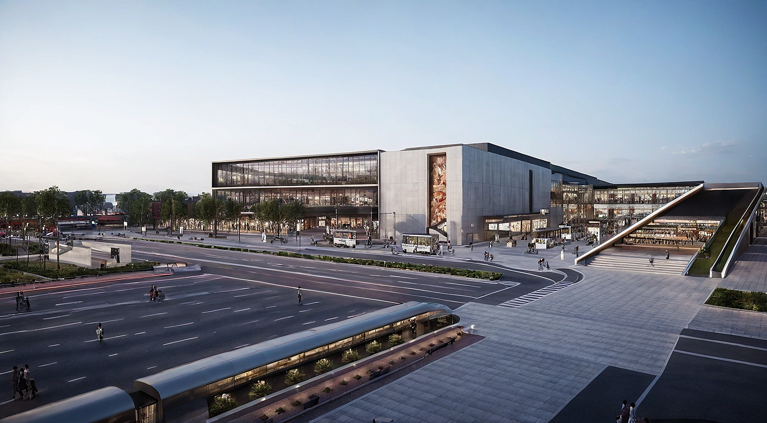 Render and design the facade of this civil building a museum, shopping center, cinema in a social district in the center of the city. Also add greenery where possible. add steeped seating with greenery to the ramp.. the train carts are kiosks. keep all images i upload for this prompt within a similar theme.