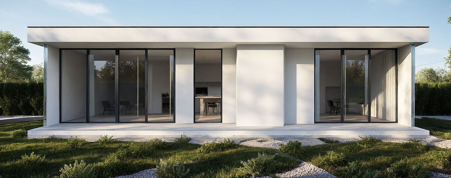 Prompt"Render a photorealistic exterior visualization of a single-story minimalist house, strictly preserving the original 3D geometry with no alterations to shape or volume. The house must feature a flat roof, smooth matte white stucco walls, and white-painted steel structural columns. Window and door openings must remain exactly as in the model, with aluminum-finish slim profiles and transparent glass. Set the scene at golden hour for soft warm light, creating long shadows and subtle highlights. The camera should capture a clean, frontal perspective, emphasizing rhythm and negative space. Landscaping should be dry-climate and low-maintenance: gravel beds, native grasses, and neatly arranged clumps of soft-textured vegetation. Avoid overgrown or tropical foliage. Frame the scene with a few dispersed deciduous trees to provide dappled sunlight. Ensure all vegetation is positioned to enhance, not obstruct, the geometry or façade. Background elements should be minimal and dissolve into the natural terrain. The result should evoke serene elegance, architectural clarity, and harmony with nature."