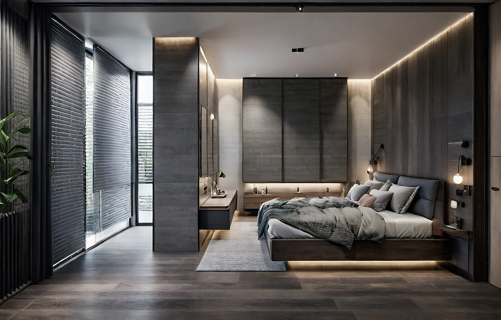 Promptmodern scandinavian bedroom, with grey cabinet, and dark wood accent roll blind window. big slab ceramic tile