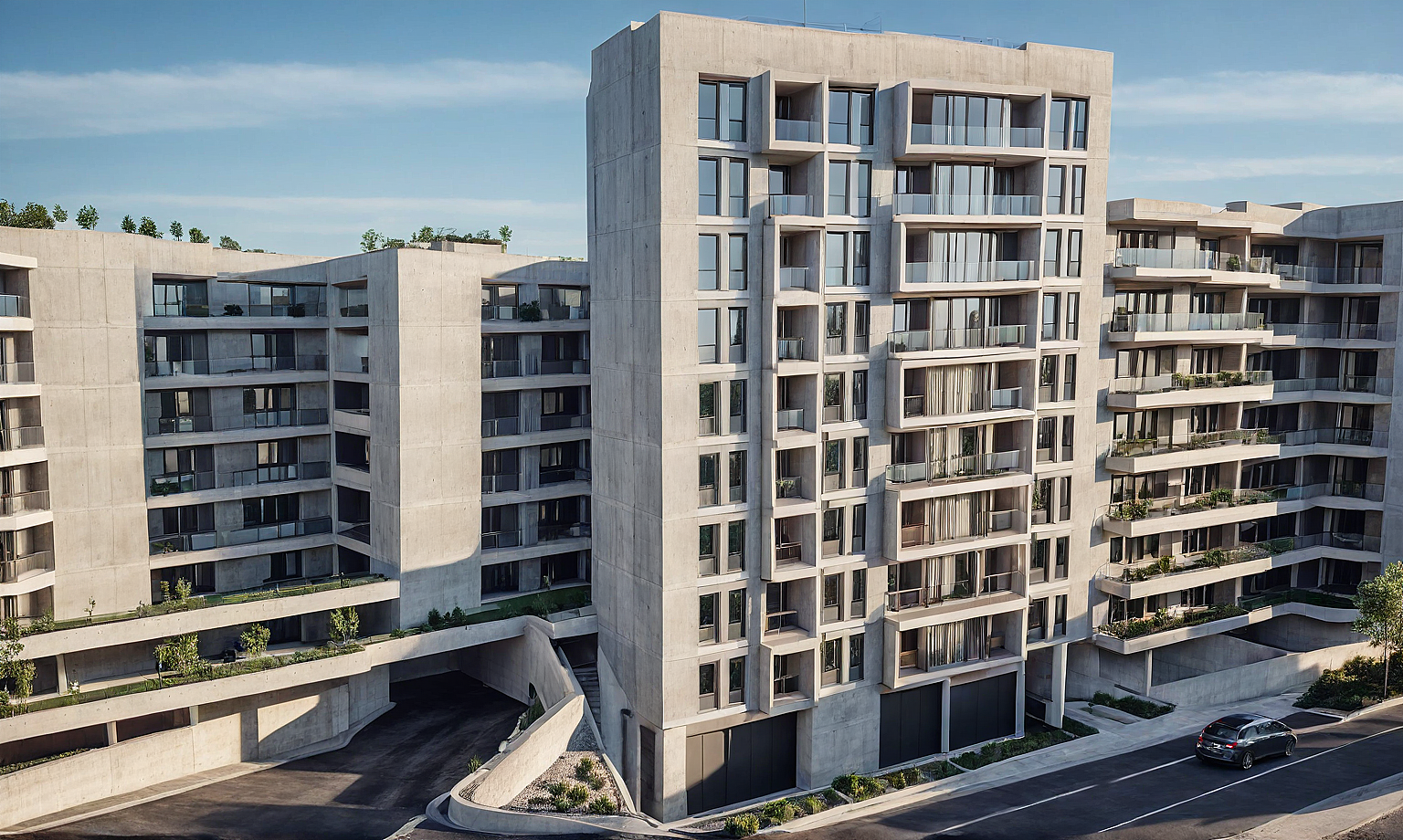 Promptmodern architecture, luxury apartament, neighborhood landscape,concrete facade,balcony,underground parking