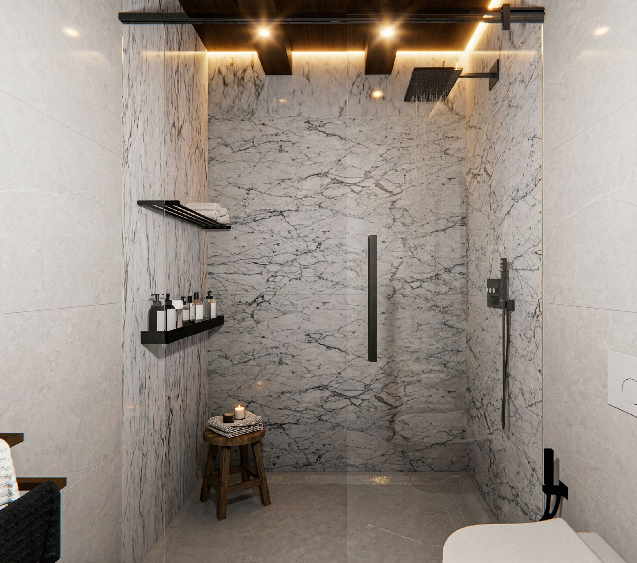 Promptthis is a scene of a shower room don't change the material and don't add any thing ,, i want you to enhance the materials and the lighting of the spotlight on the ceiling and make scene and the effect realistic and beautiful no sun light needed, keep exact camera angle