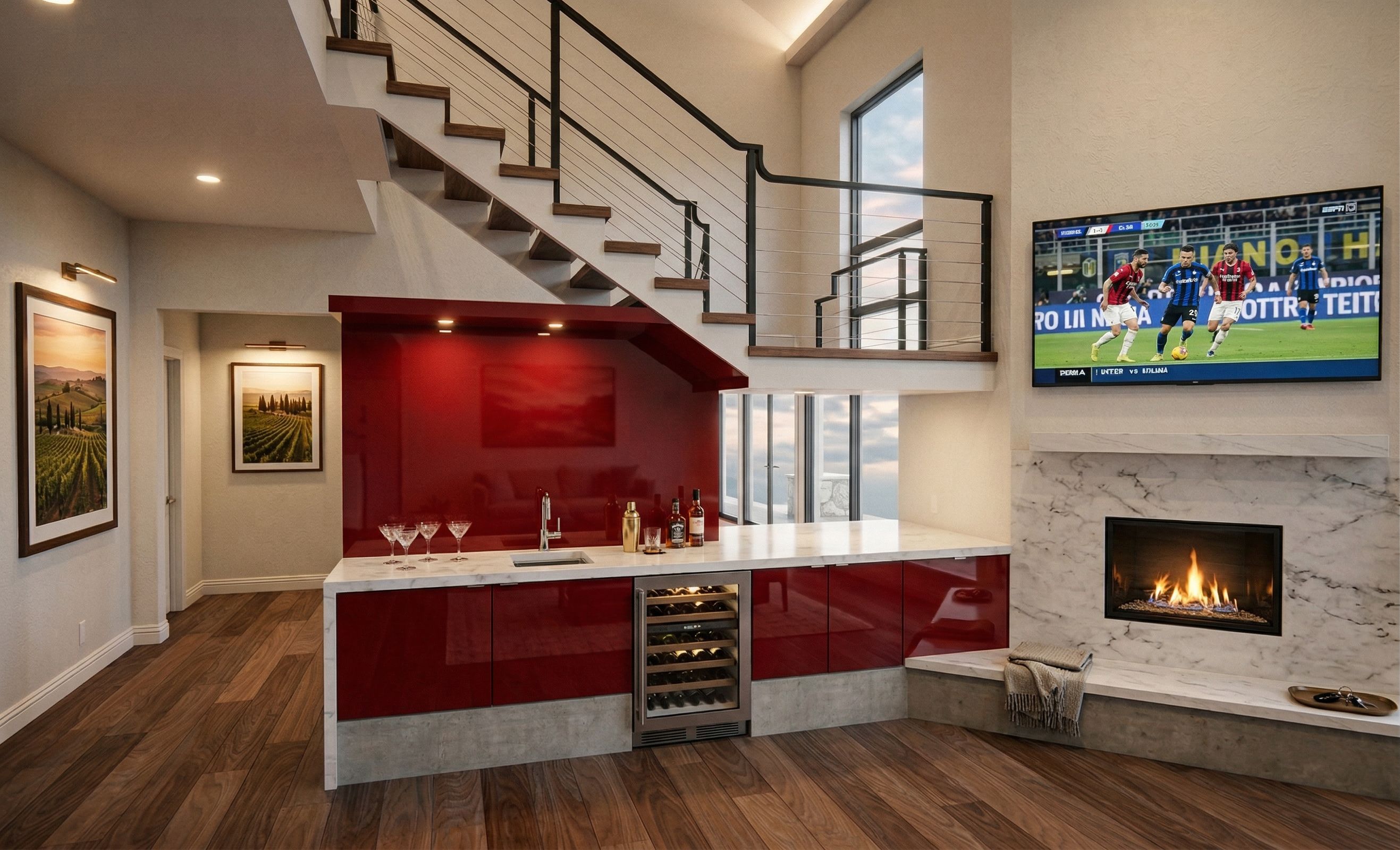 Promptmake photorealistic rendering from this image add wet bar under the stairs next to fireplace as indicated by red area design it so the fireplace and wet bar are connected fireplace is direct vent gas fireplace, show fireplace on burning, fireplace wall is drywall TV above the fireplace is playing Italian soccer game change yellow picture frame with Italian countryside scene skies trough the upper window lights on in the room add light fixtures where appropriate , keep exact camera angle