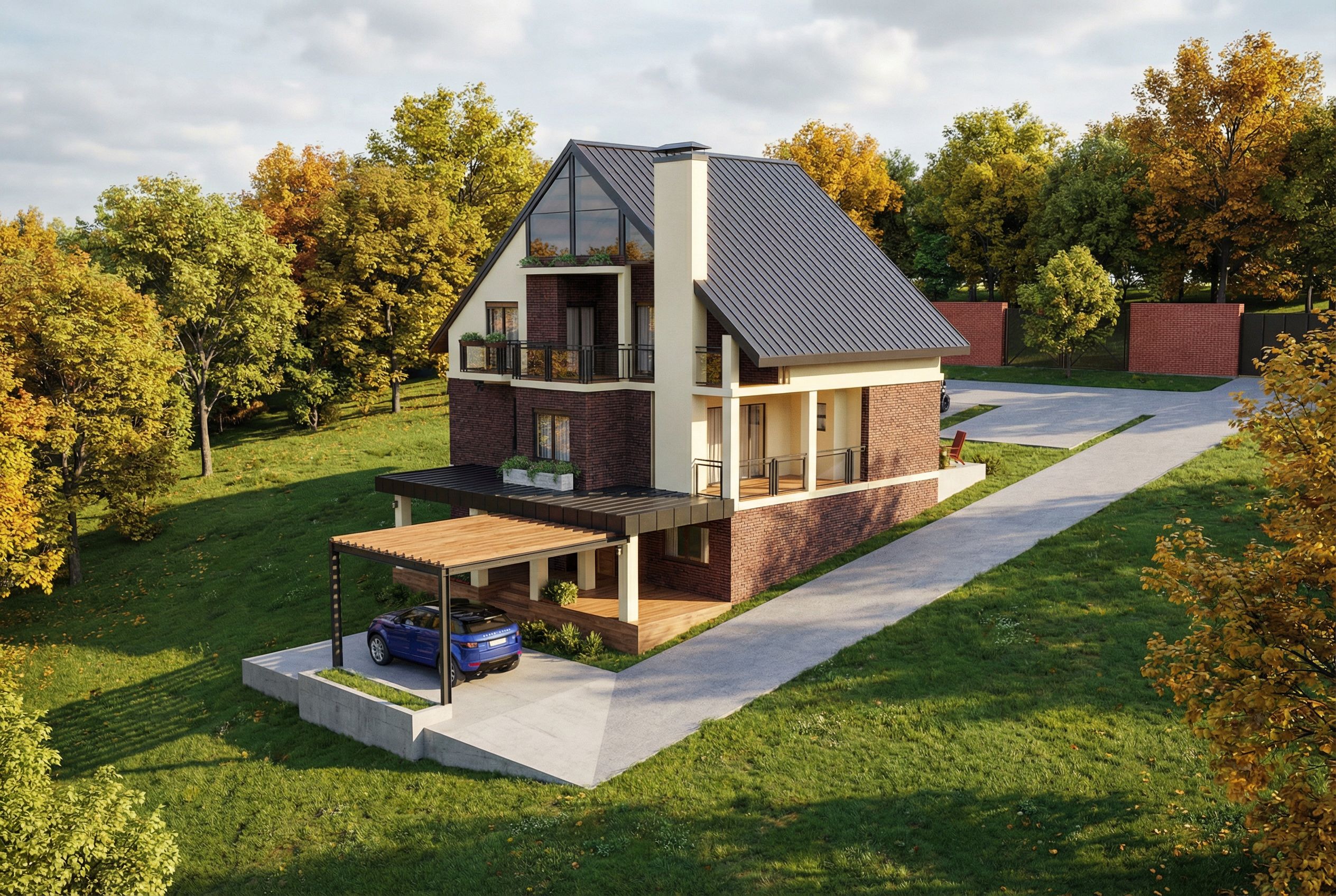 Promptarchitectural exterior rendering, render this sketch into photorealistic rendering, urban masterplan visualization, render this sketch into photorealistic rendering, his is the exterior of a German-style multi-family dwelling, located in a field with many trees. A red brick wall and driveways are visible., aerial view from above, including greenery and vegetation, high quality, professional, detailed scene, keep exact camera angle, including greenery and vegetation, trees, high quality, professional, detailed scene