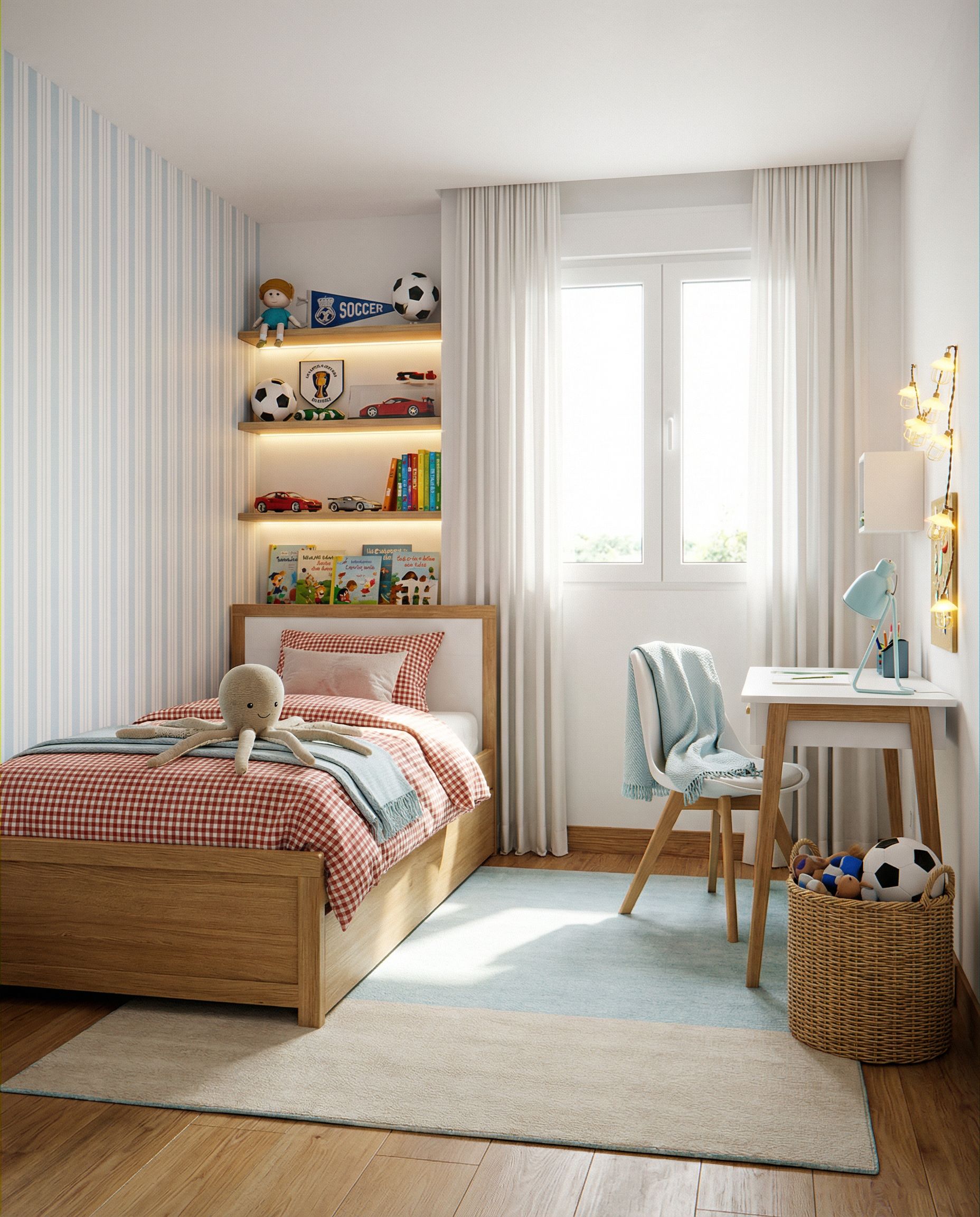 habitación de un niño pequeño. suelo de madera de roble. paredes blancas y techo blanco. pared de la izquierda con un papel pintado con lineas azules Claritas y blancas. cama individual con estructura de la cama de madera de roble. cabecero de la cama blanco. encima del cabecero de la cama dos estanterías con luces led indirectas cada balda, con elementos de decoración de un niños pequeño juguetes, cosas de futbol, coches, libros... la ropa de la cama será como la imagen de referencia. la ventana de la pared del fondo tiene una carpintería de pvc blanca. los rodapiés de toda la habitación son del mismo material que el suelo. a la ventana añádele unas cortinas blancas de suelo a techo. en el lado derecho contra la pared hay un escritorio con las patas de madera y la parte superior de color blanco. la silla del escritorio tiene las patas de madera y la silla blanca, encima de la silla se encuentra una manta colgada de color azul clarito. el escritorio tiene un flexo azul clarito y encima colgado en la pared unas luces decorativas en guirnalda. al lado del escritorio hay una cesta de mimbre con juguetes y un balón de futbol. en el suelo hay una alfombra de color azul clarito y beigue. entra luz natural por la ventana y hay luces calidas.