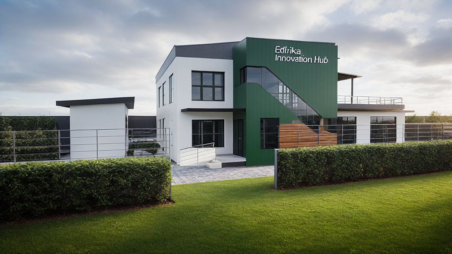 Building is a Technology Innovation Hub. Maintain existing wall colours, frontal green wall to be aluminium composite panels. Include interior training room furniture. Interior warm white lights, exterior wall lamps and lights. Few nice cars. Modern sophisticated look. Add trees to rear and sides of property. Add few masquerade trees. Maintain all colors but make them better. Keep the texts as it is, the text remains as Edfrika Innovation Hub