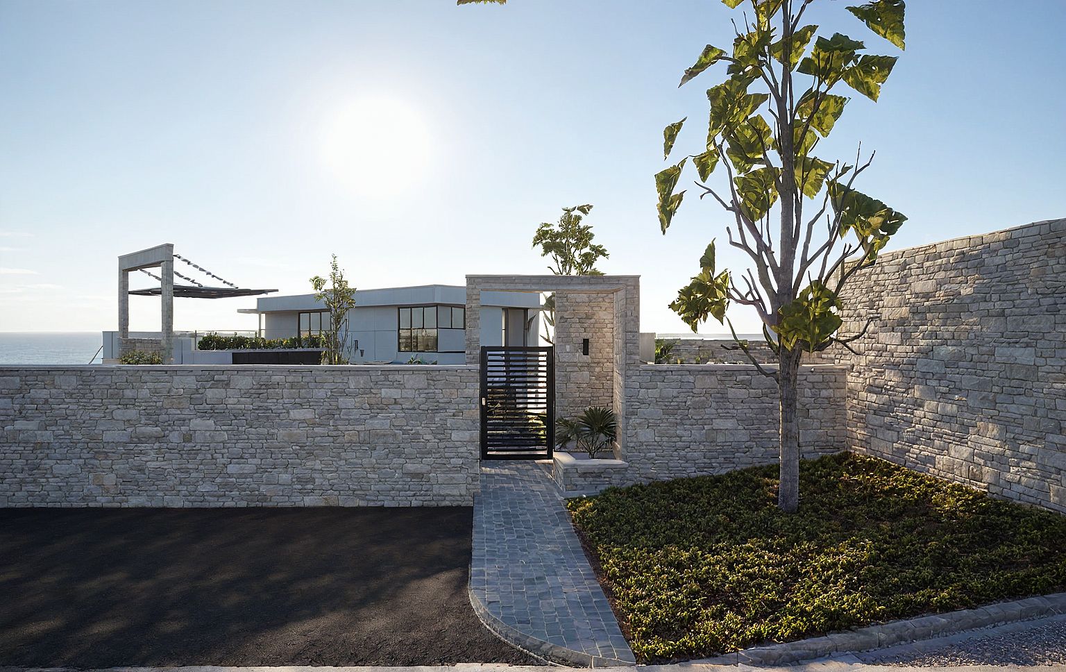Create a daytime photorealistic architectural render of a contemporary residential driveway framed by beige stone walls. The driveway is paved with cobblestone. The foreground shows a mazeras walkway edged in smooth concrete leading to a black steel gate. Beside it is a planter with a shrub, and a Bi-Directional Wall Luminaire turned on lighting up and down. The background feature a white contemporary house peaking over the wall. Vegetation details: low-maintenance greenery and small shrubs along the wall bases. Lighting: bright clear midday with soft natural shadows, realistic reflections on the car body and glass surfaces, and slightly warm sunlight to enhance the stone texture. Camera angle: eye-level perspective following the driveway toward the distant gate and horizon, sky rendered as pale blue with light cloud wisps.