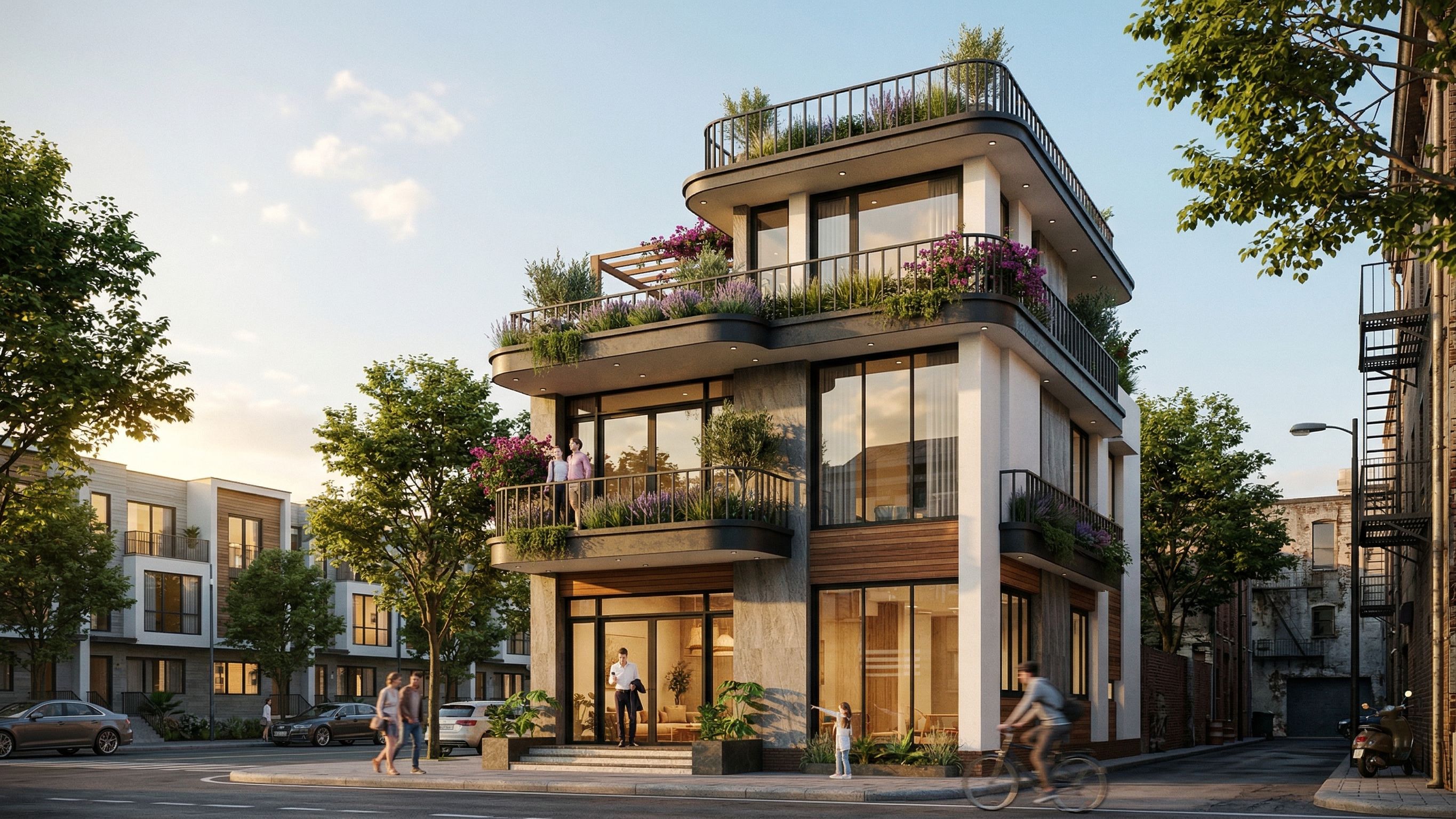 PromptThis photograph captures a modern three-story apartment building, notable for its combination of gleaming white walls, dark metal railings, and warm wood accents. Surrounding greenery and balconies create a vibrant atmosphere. The building is situated in a lush urban environment, with a small alley to the right and a row of townhouses to the left, contributing to an enhanced quality of life. Cloudy daylight creates soft shadows, illuminating the expansive glass facades. Inside, bright light highlights the reflections of the glass and surrounding structures. Without altering the building's structure, the photograph is taken from a low angle to emphasize its height, using a wide-angle lens to encompass the entire scene, highlighting the architectural features and the welcoming atmosphere., keep exact camera angle