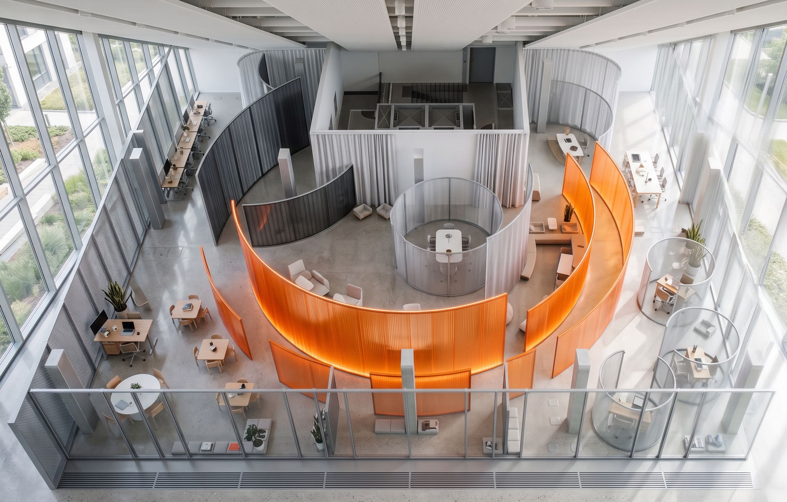 PromptComplete this office workspace 3D render with realistic materials and finishes: KINETIC LOOP (orange curved band): - Material: Frosted orange striped glass, translucent - Color: On Running orange (RAL 2003, #FF6600) - Texture: Vertical striation pattern, light diffusion - Thickness: 10cm double glass panel - Finish: Semi-transparent, glowing effect with natural light CELL MEMBRANES (gray partitions): - Creation cell (left curved area): Dark gray striated polycarbonate, semi-opaque, privacy screen - Management cells (circular bubbles): Semi-transparent mesh fabric panels, light gray metallic - Activation cells (right side): Clear transparent glass, 8cm thickness, minimal visual barrier CURTAIN DIVIDERS (dashed lines): - Material: Light textile curtain, white or light gray - Hanging system: Ceiling-mounted rail, barely visible - Texture: Soft draping fabric, semi-transparent when closed MESH METAL PANELS: - Material: Perforated metal mesh, aluminum - Color: Metallic gray/silver - Pattern: Regular grid perforation, semi-transparent - Finish: Anodized aluminum GENERAL FINISHES: - Floor: Polished concrete, light gray - Ceiling: White acoustic panels with exposed structure - Furniture: Mix of natural wood (beech/oak) and white surfaces - Color palette: Silver/gray metallic + Swiss white + On Running orange accents only on Loop contact points Lighting: Natural daylight from windows + warm ambient LED lighting Style: Contemporary Swiss minimalism meets athletic brand energy Camera: Isometric architectural visualization, clean professional rendering, keep exact camera angle