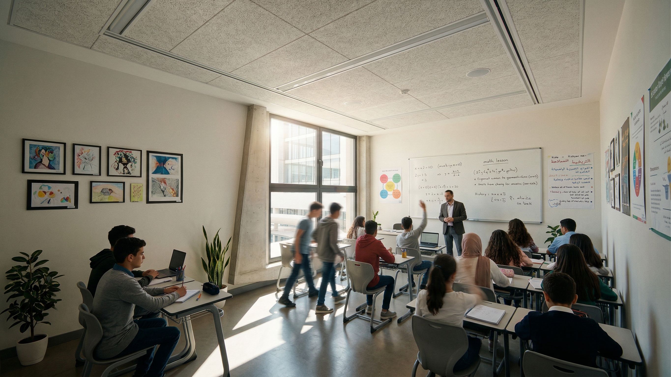 it is the interior 0f a modern Syrian school and it shows the inner classroom ... make the scene super realistic .. it is a classroom so do simple interior design of a classroom and add teacher and 20 high school students and classroom things and keep the view from the window the same don't add more windows , keep exact camera angle