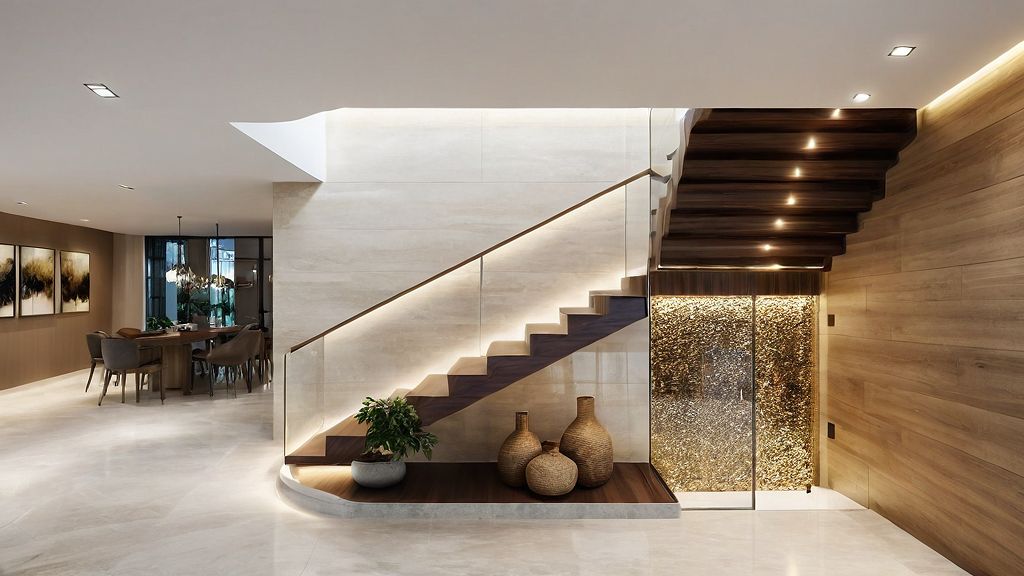 PromptImagen realista. Vestíbulo de escalera de casa residencial de lujo, piso tipo mármol con vetas beiges, los escalones son recbiertos por cerámica tipo madera, el acabado en muros con tapiz con patrón vertical, con brillos dorados sutiles y discretos, barandal de escalera en cristal ahumado con pasamanos de madera nogal, zoclo decorativo frente a escalera con marmol oscuro y jarrones decorativos, al fondo se observa comedor. El vestíbulo es luminoso, recibe la luz indirecta de un ventanal El ambiente es acogedor, con un toque de naturaleza.