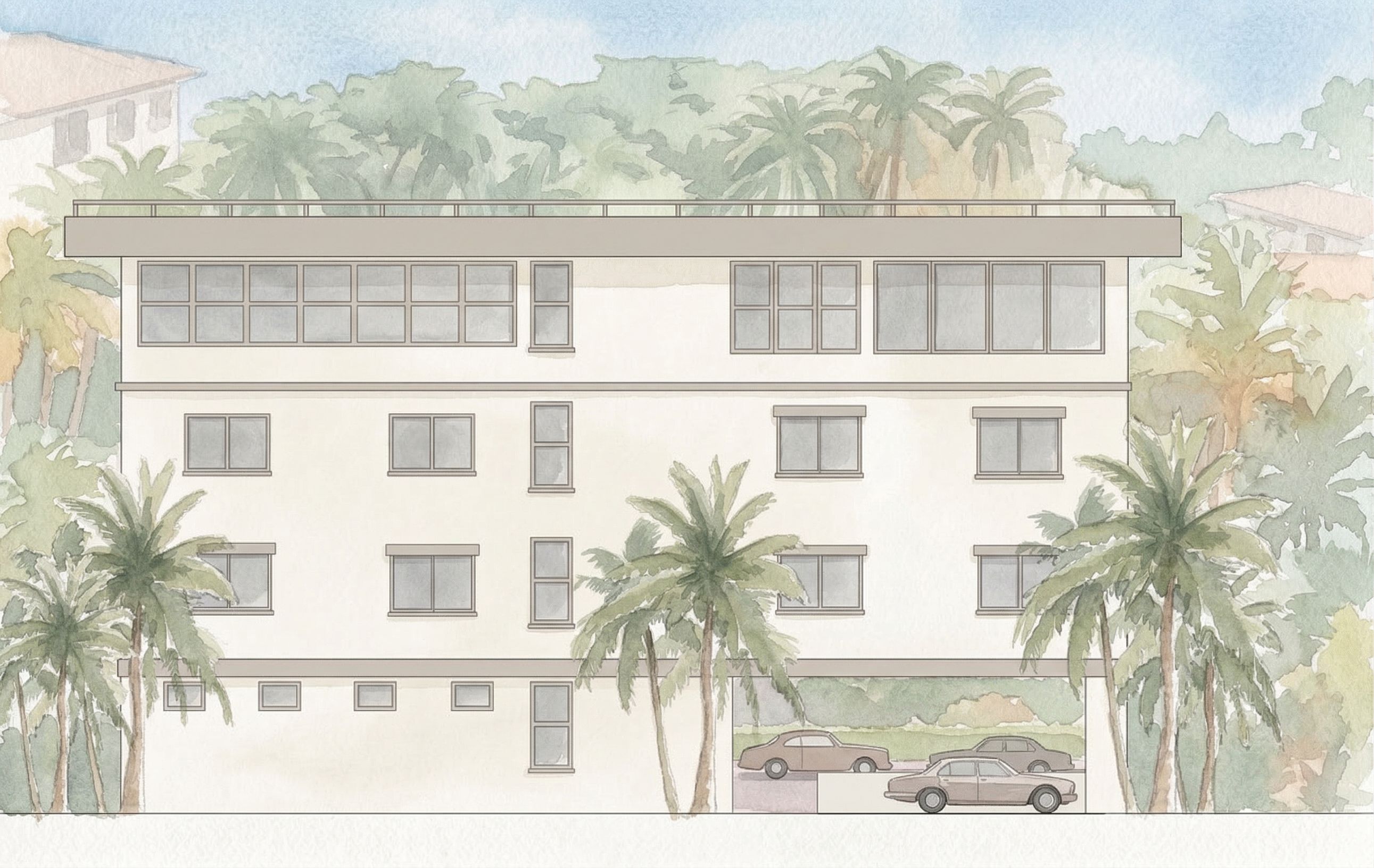 DO NOT change the architecture in any way. Do not alter proportions, windows, railings, or layout. Keep the view perfectly front-on and orthographic. Do not crop the image. STYLE: Soft watercolor architectural presentation Balanced between precision and artistic softness Clean linework remains visible and crisp Gentle color bleeding and soft edges in background elements only BUILDING KEEP CONTROLLED: Main stucco: warm creamy white HEX #F4F1EA Very subtle tonal variation for depth no heavy shadows Windows: soft gray tone, minimal reflection Railings and frames: muted taupe HEX #C8C1B6 Keep building edges sharp and readable NOT blurry BACKGROUND + LANDSCAPE THIS IS THE FIX: Fully reinterpret the background in a soft watercolor style Palm trees should be loose, painterly, and slightly blended with soft edges Use desaturated greens and warm natural tones Allow light watercolor bleed in foliage and sky Background buildings should be simplified, softened, and slightly faded Sky should be a soft blue wash with subtle cloud texture CARS IMPORTANT: Replace cars with simple, elegant watercolor-style vehicles Minimal detail, soft edges, neutral tones Avoid hard outlines or photoreal reflections MOOD: Romantic, airy, and elegant Cohesive overall tone — everything should feel like part of the same painting Calm and inviting, suitable for a high-end Palm Beach presentation IMPORTANT: The building remains the sharpest and most defined element The background, trees, and cars should be softer and more painterly Ensure the entire image feels unified in one consistent watercolor style, keep exact camera angle