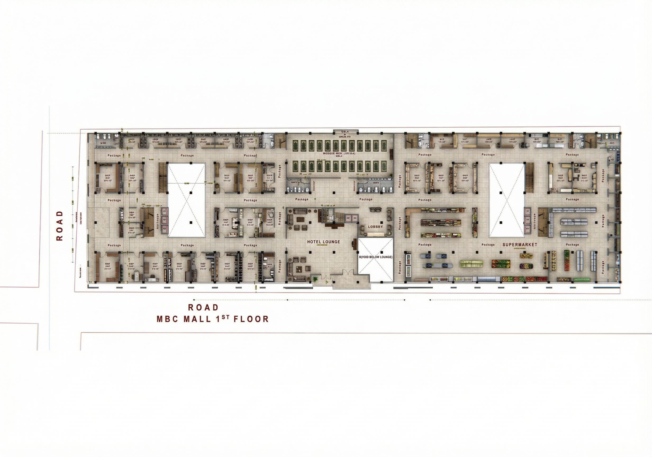 LAYOUT SHOWING MALL SHOPS, SUPERMARKET ON THE LOWER RIGHT . A MOSQUE ON THE UPPER SIDE SHOWING PRAYER MATS FACING THE QIBLA.CLEARLY SHOW ACTUAL SHOP NUMBERS AND SIZES AS INDICATED AND THE WASH ROOMS. SHOW THE HOTEL LOUNGE. LOBBY AND LIFTS. MAKE LAYOUT REALISTIC AND TWO DIMENSIONAL. MAKE LAYOUT REALISTIC AND HIGH RESOLUTION 8K. USE ACTUAL NUMBERING OF SHOPS AS THE ORIGINAL LAYOUT. USE CERAMIC TILES AS THE FLOOR FINISH. USE ACTUAL LAYOUT AND ANNOTATIONS AND MAKE LAYOUT REALISTIC AND 8K RESOLUTION. SHOW WHOLE LAYOUT AND ALL VOIDS AS INDICATED.SHOW WHOLE LAYOUT. INDICATE ALL THE VOIDS IN THE ORIGINAL PLAN BVOID BELOW LOUNGE. MAKE LAYOUT REALISTIC., keep exact camera angle