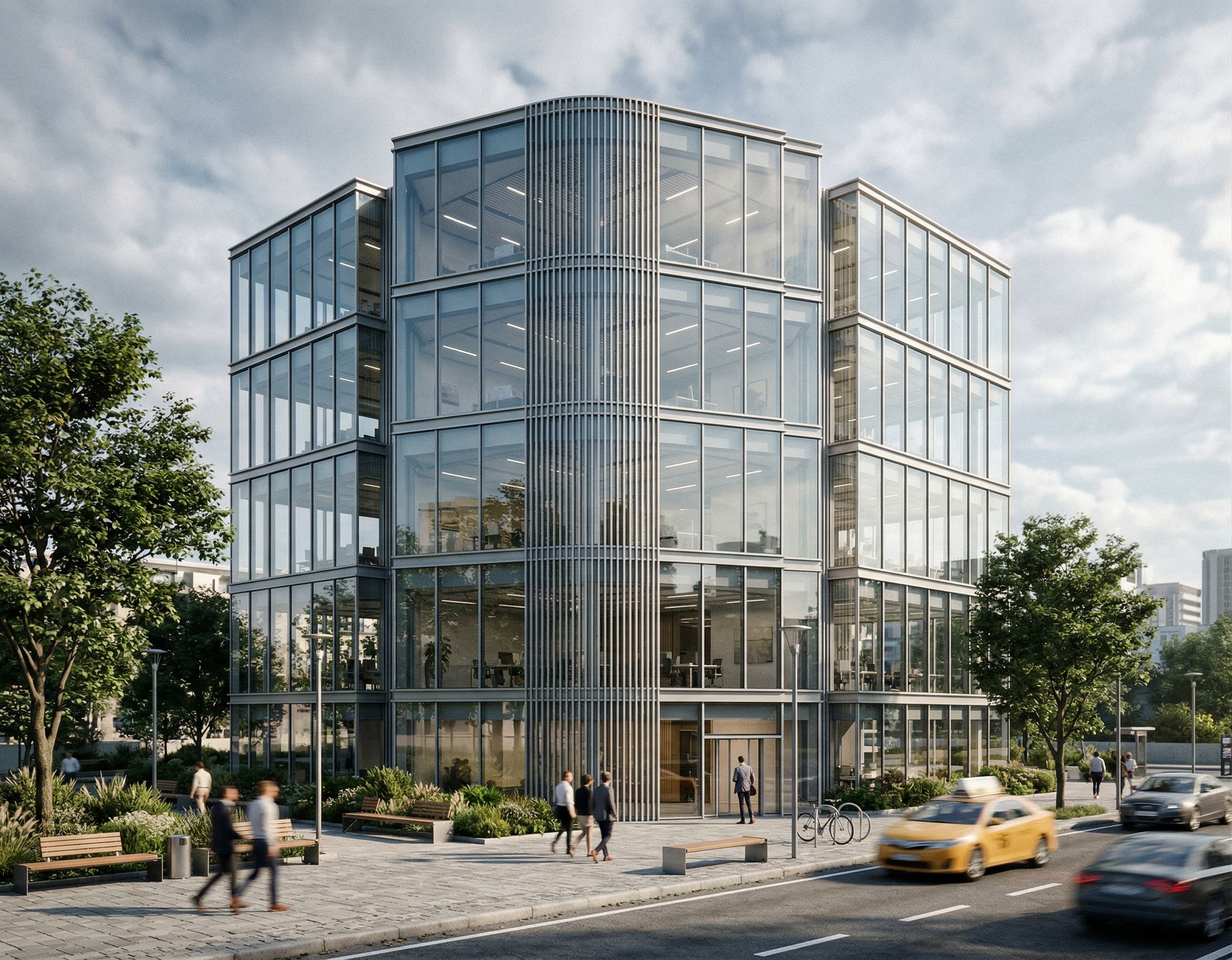 Promptgenerate a super realistic render for this commercial building with glass facade it is a five floor building including ground floor do not change the shape of the building , keep exact camera angle