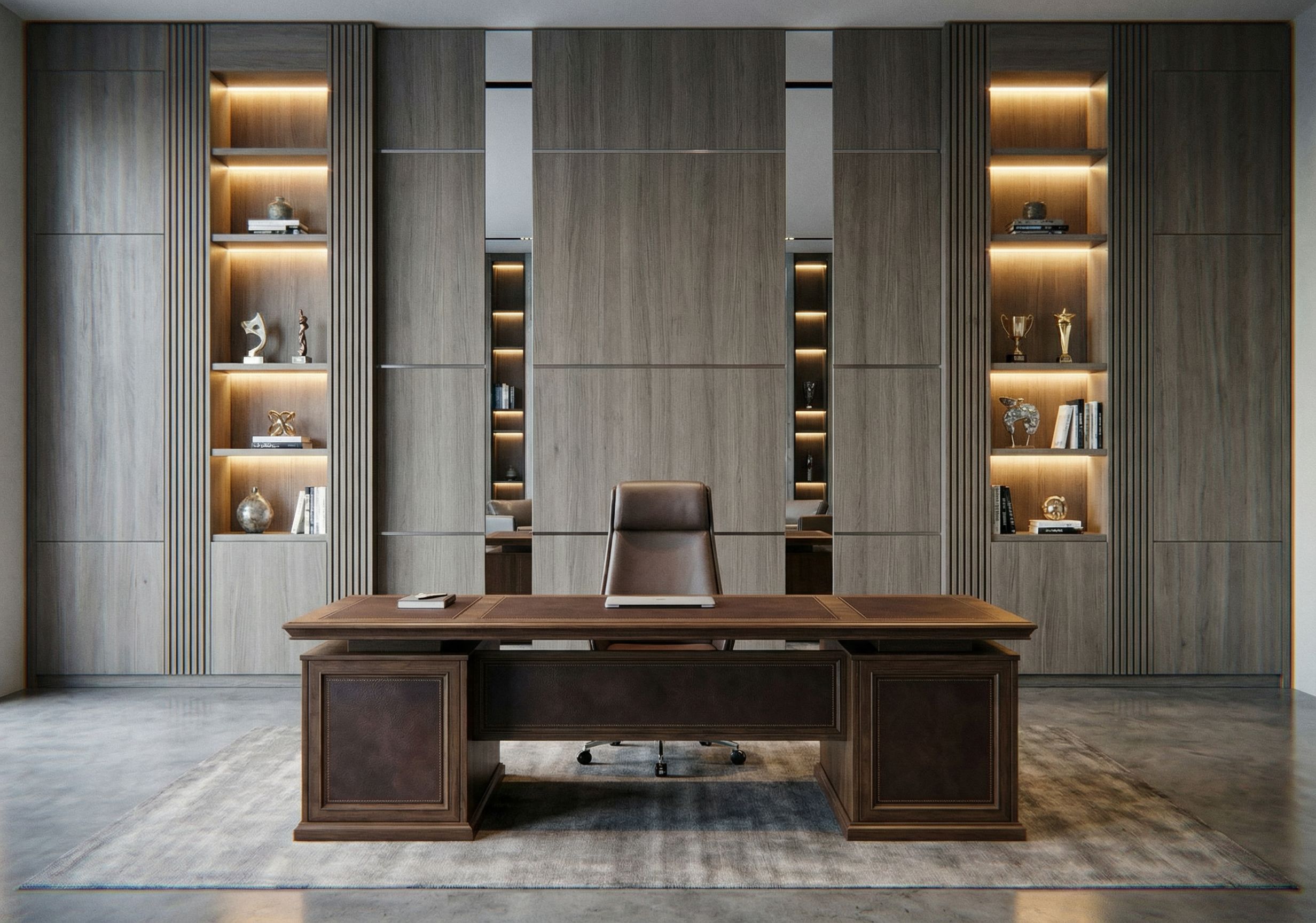 Promptالتفصيلة هي لديكور جداري خلف مكتب المدير ويوجد في الجزء الايمن و الايسر خزانة مع اضاءة من الجنب الداخلي للخزانة واللون الازرق في المنتصف على شكل خطين شاقوليين هما مرايا و المطلوب تخيل التصميم مع مواد الاكساء المناسبة علما انني احتاج الخشب هو مائل للرمادي مع الالتزام التام بالتفصيلة المرفقة, keep exact camera angle