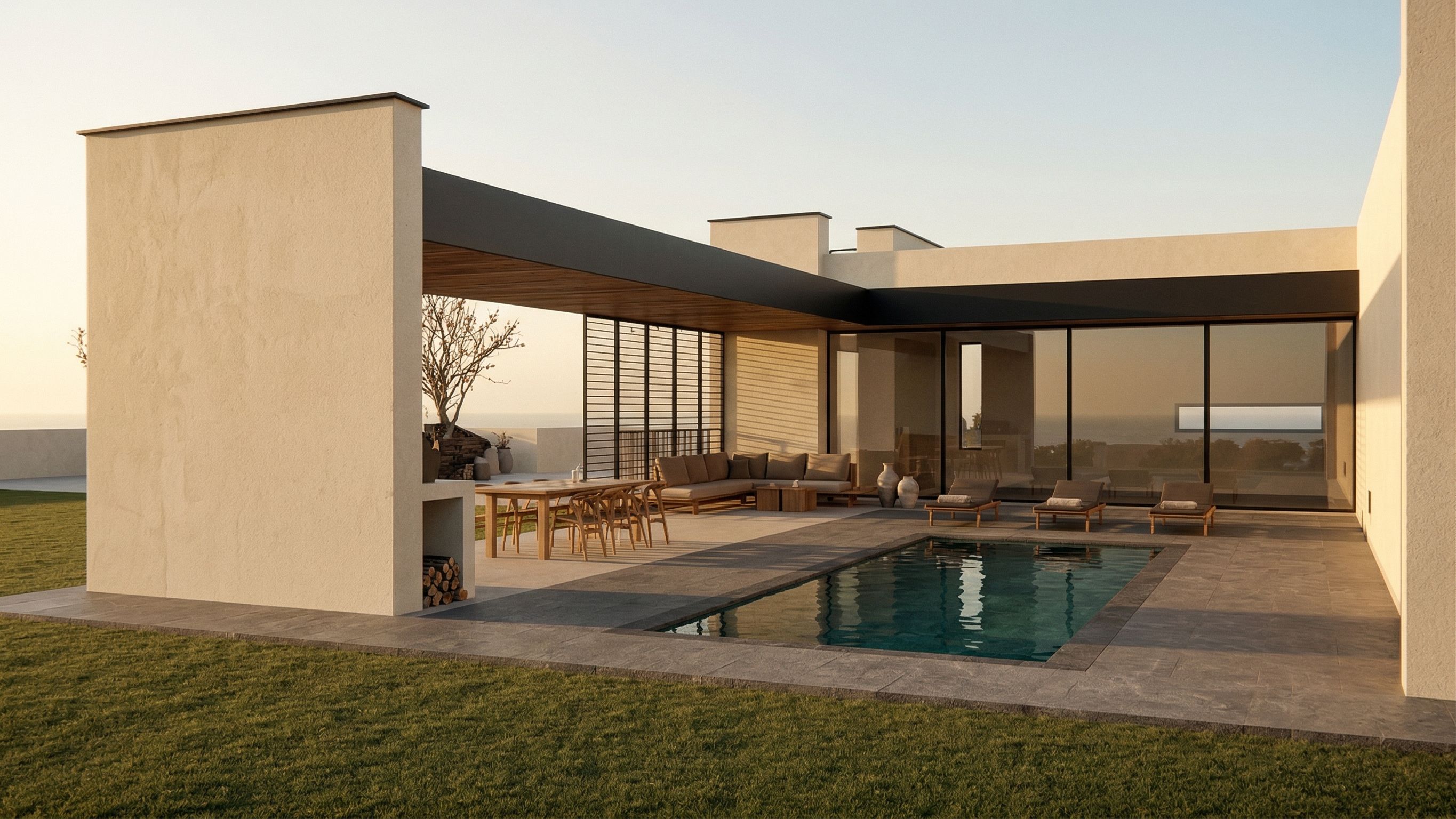 Promptπισινα σε χρωμα μπαλι, παραθυρα μαυρα μπεζ αποχρωση ξυλινη οροφη, keep exact camera angle