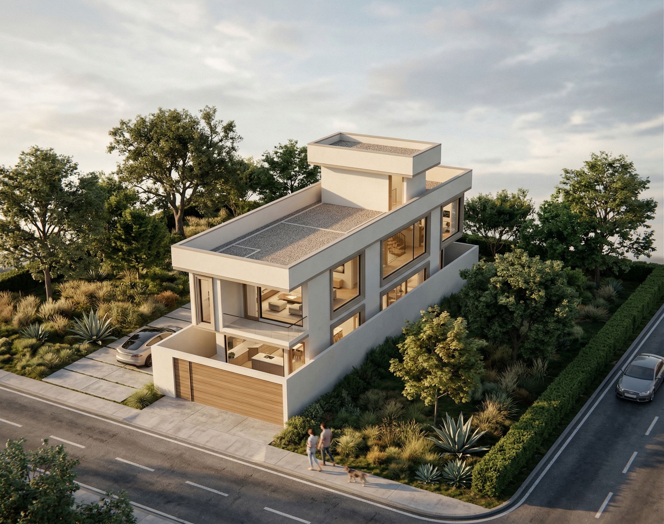 AERIAL VIEW OF A HOUSE , A MASSIONNETTE. INCLUDE MOULDINGS IN WINDOWS AND OPENINGS. USE BAIGE AND DARKER SHADES OF BEIGE IN THE MOULDINGS. MAKE THE GLASS CLEAR, REALISTIC AND TRANSPARENT., keep exact camera angle. , keep exact camera angle