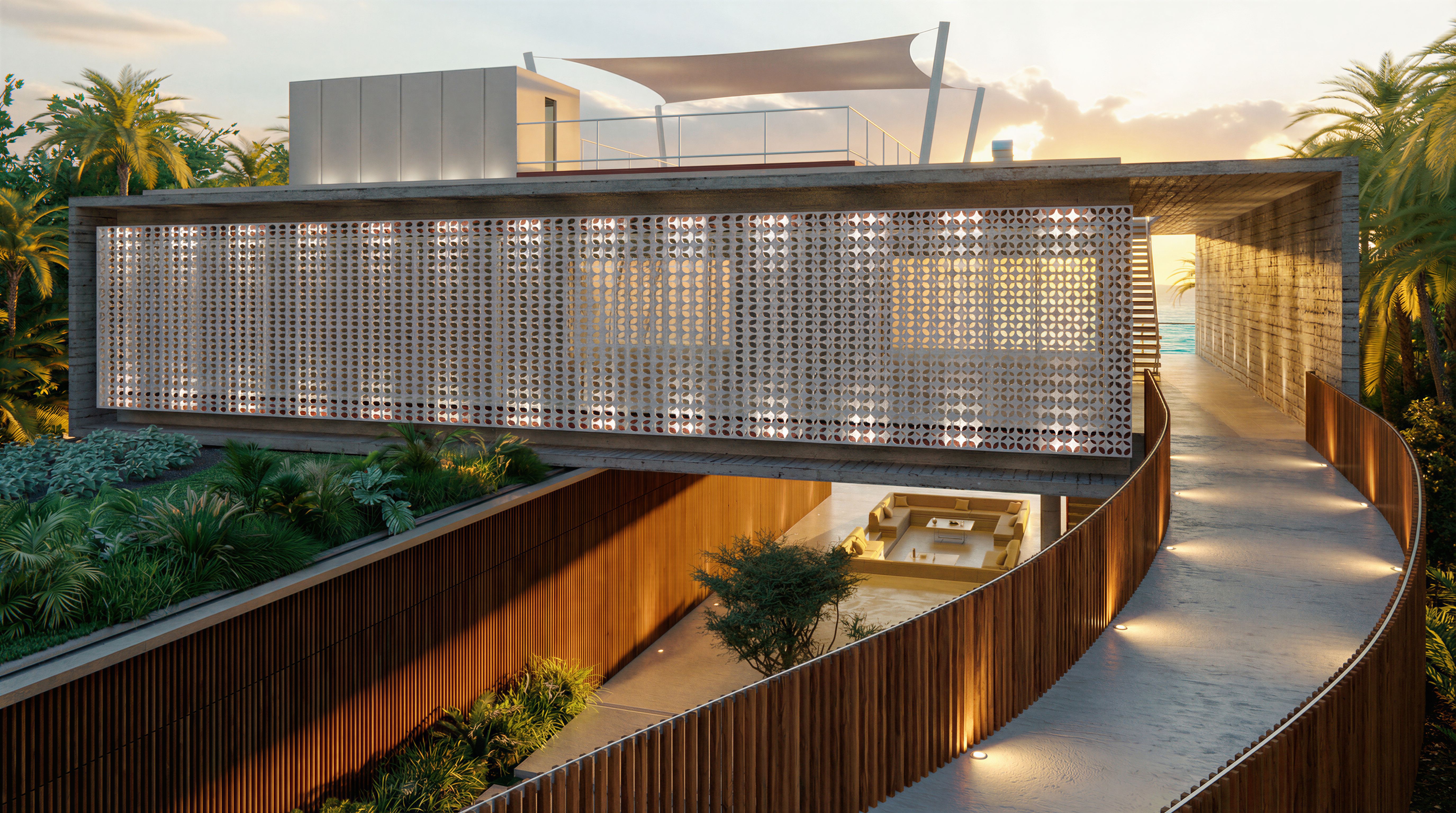 mejora la integración entre el hormigón de la pasarela y del del pasillo con un hormigón más natural. genera mas contraste de luces y sombras. coloca focos en el lado derecho del suelo de la pasarela y del pasillo que continúa despueés de la pasarela. añade un pavimento hormigón visto en el suelo del rellano de la parte de abajo y también en la parte de afuera. coloca cesped y vegetación en el suelo junto a la pared de madera. Aplica más realismo a las palmeras y vegetación que ya aparece en la imagen. Aplica más realismo y claridad al mar que se ve al final del pasillo y de la imagen. respetando la forma de los sillones, aplica mas realismo a las telas. Aplica mas naturalidad de luces y sombras entre las paredes y el suelo de abajo., keep exact camera angle