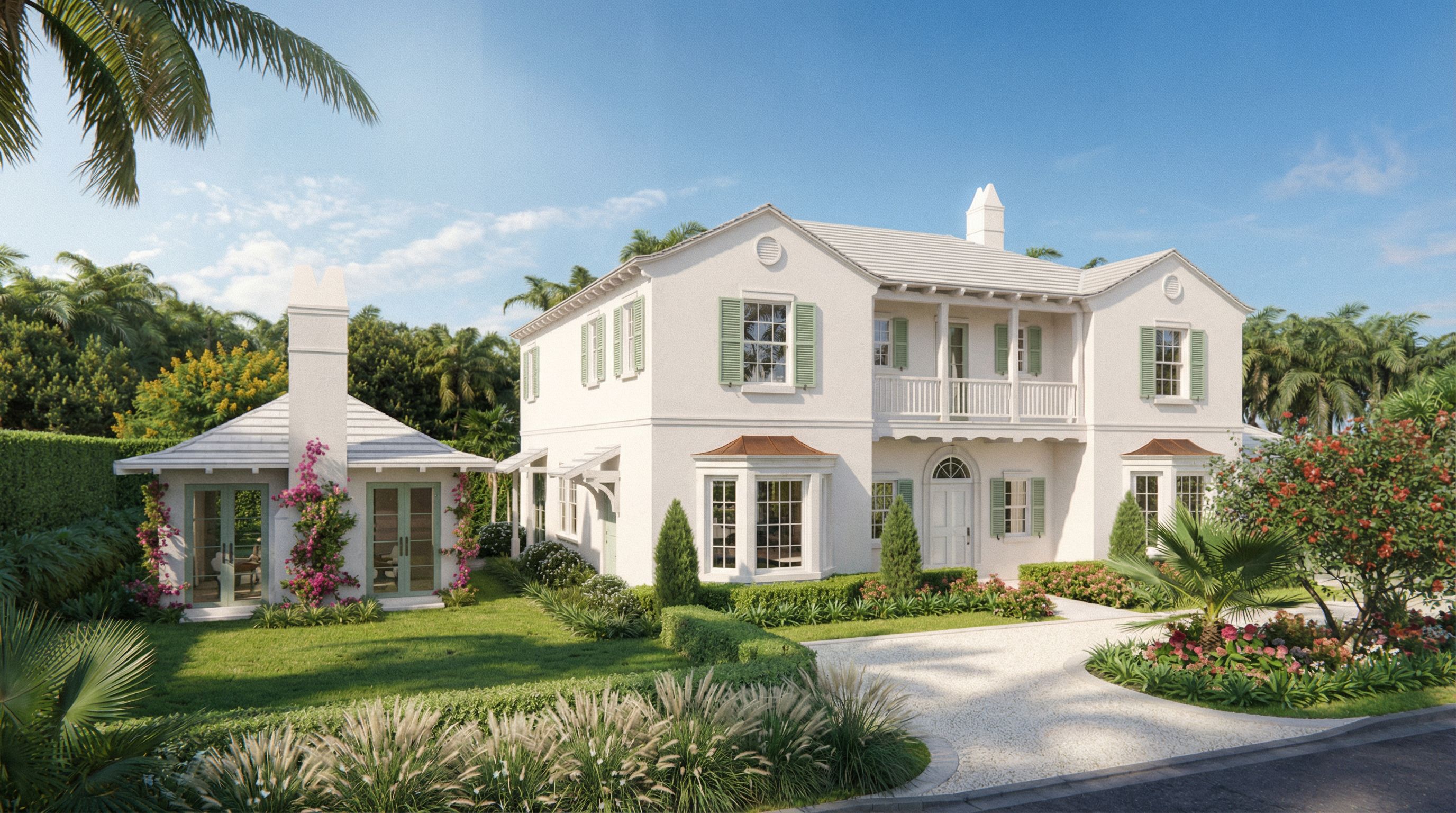 PromptUltra-photorealistic architectural exterior rendering created directly from the provided front elevation drawing. The elevation must be treated as the strict architectural blueprint. All proportions, roof heights, window spacing, façade alignment, and architectural linework must match the elevation exactly with no modifications. Architecture style: refined Monterey Colonial residence with elegant coastal Palm Beach character. Site composition and depth: The composition contains a main house and a detached cabana. The cabana sits approximately 25 feet from the front property line while the main house sits approximately 30 feet from the front property line. The cabana should therefore appear only slightly forward of the main house. The depth difference should remain subtle and not exaggerated in perspective. Cabana façade layout: The cabana contains a centered stucco chimney. On each side of the chimney there is a full-height glass door. The doors are symmetrical and positioned evenly on both sides of the chimney exactly as shown in the elevation. The doors are painted white and must not be replaced with windows or merged into a single centered opening. Materials: Exterior walls: smooth white stucco with refined plaster texture and crisp architectural shadow lines Window surrounds, headers, and sills: white stucco matching the walls Columns, balcony railings, rafters, and exposed wood elements: whitewashed pecky cypress with a smooth matte finish and extremely subtle grain that is barely visible Roof: white concrete tile roof with realistic tile depth and matte finish Bay window roofs: natural copper roofs with soft realistic patina tones, muted and complementary, not shiny or reflective Shutters: Benjamin Moore Fresh Dew soft pale mint green Front door: painted white Garage door: painted white Chimneys: stucco chimneys matching the main walls Architectural character: Classic Monterey style second-floor balcony with wood posts and railings Refined colonial proportions Clean symmetrical façade composition matching the elevation Lighting: Bright **mid-afternoon daylight (approximately 3 PM)** with clear sky conditions. Sun positioned generally behind and slightly to the side of the camera so the **entire front façade and the secondary visible side of the building are both well illuminated**. Soft daylight evenly lighting both visible building faces with minimal harsh shadows. Natural ambient sky light and reflected light brightening shaded areas so the architecture reads clearly on both faces. Environment: Palm Beach coastal landscaping with palms and ornamental grasses Light shell stone or limestone driveway and walkway Bright blue coastal sky with soft natural clouds Camera and composition: Cinematic architectural money-shot perspective Three-quarter perspective showing the depth of the architecture while keeping the front façade dominant Camera slightly offset from center 35mm architectural lens for natural perspective without distortion Eye-level architectural photography viewpoint Rendering style: Ultra photorealistic architectural visualization Luxury architectural photography quality Highly detailed materials and global illumination High dynamic range lighting 8k detail Critical constraints: Maintain the exact geometry and proportions of the provided elevation Do not modify façade layout or massing Do not change windows into doors or doors into windows Do not move the cabana dramatically forward Do not add gutters or downspouts Treat the elevation drawing as the strict blueprint for all architectural geometry match landscaping from reference image. i want this to look ultra photorealistic. and have a slight haze to the sky , keep exact camera angle