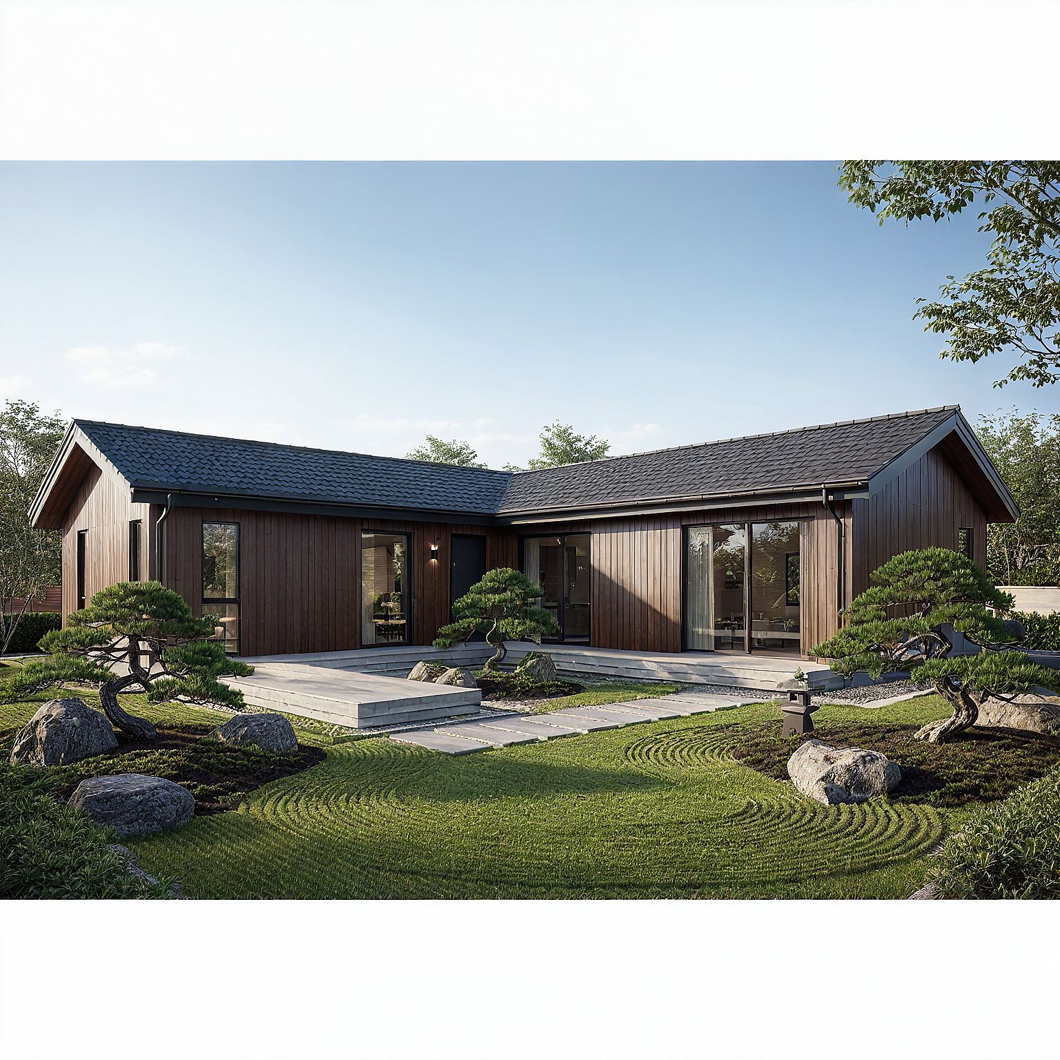 Photo of a contemporary single-story home featuring sleek, horizontal lines and a mix of modern materials. Emphasize the brown vertical siding and large windows that invite natural light. Set in a suburban environment with a lush green lawn, a tree provides shade, and a grill adds a homely touch. Bright daylight accentuates the textures, casting soft shadows across the facade. Capture a low-angle perspective to showcase the building's expansiveness, using a wide-angle lens for a more immersive view of the surroundings, enhancing the lifelike quality of the render.